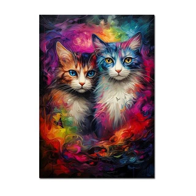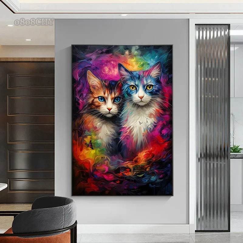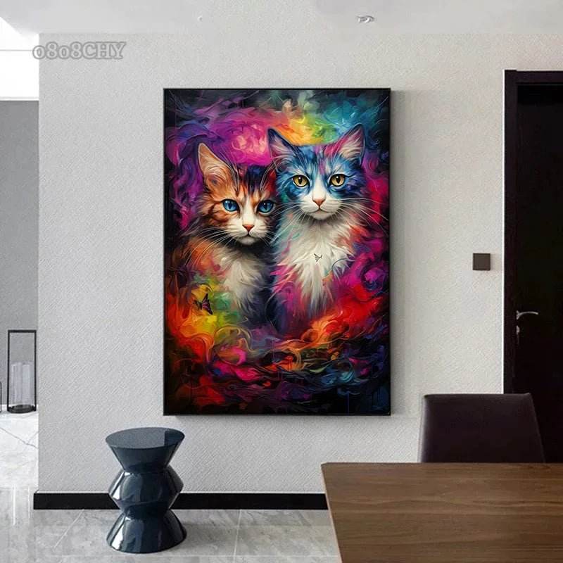 This canvas features two beautifully illustrated cats surrounded by a swirl of vibrant colors, making it a captivating centerpiece for any room. The rich hues and abstract design draw the eye, while the cats add a playful yet sophisticated element. Whether placed in a bedroom, living room, or kid's room, this piece enhances the ambiance with its artistic charm.