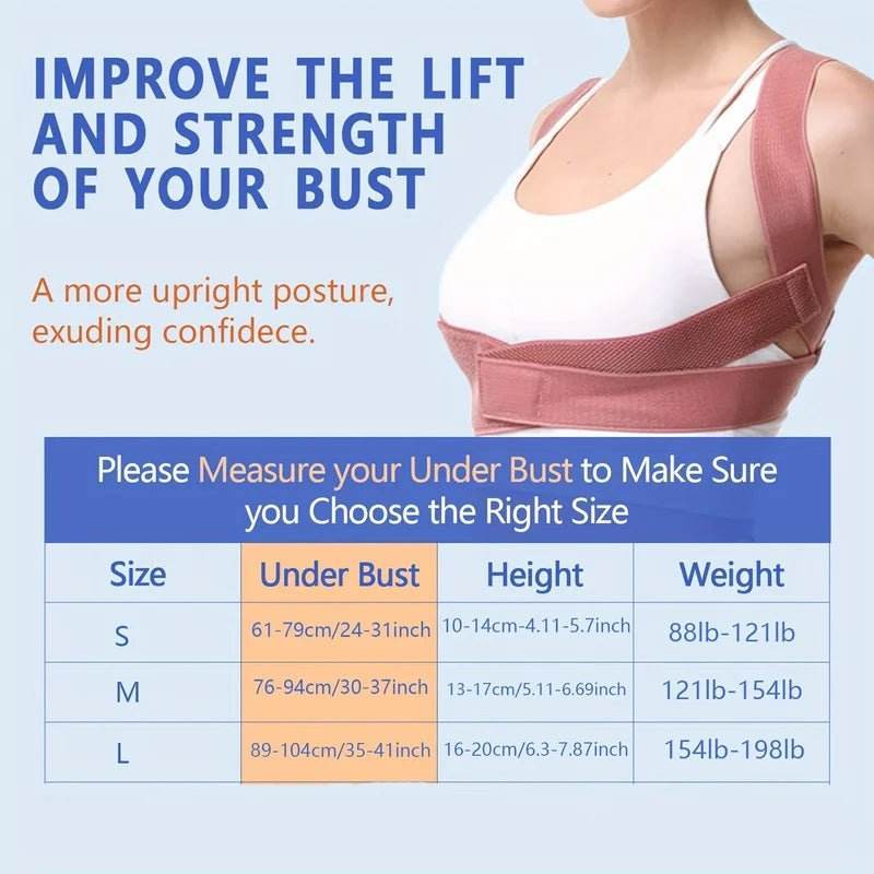 The brace is available in stylish color options, including black and pink, allowing you to choose a look that suits your personal style. Sizes range from M to L, ensuring a fit that's just right for you. The images showcase the brace's sleek design and comfortable fit, highlighting its effectiveness in promoting an upright posture.