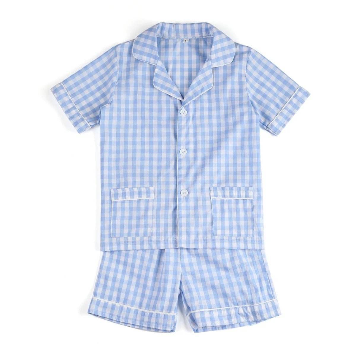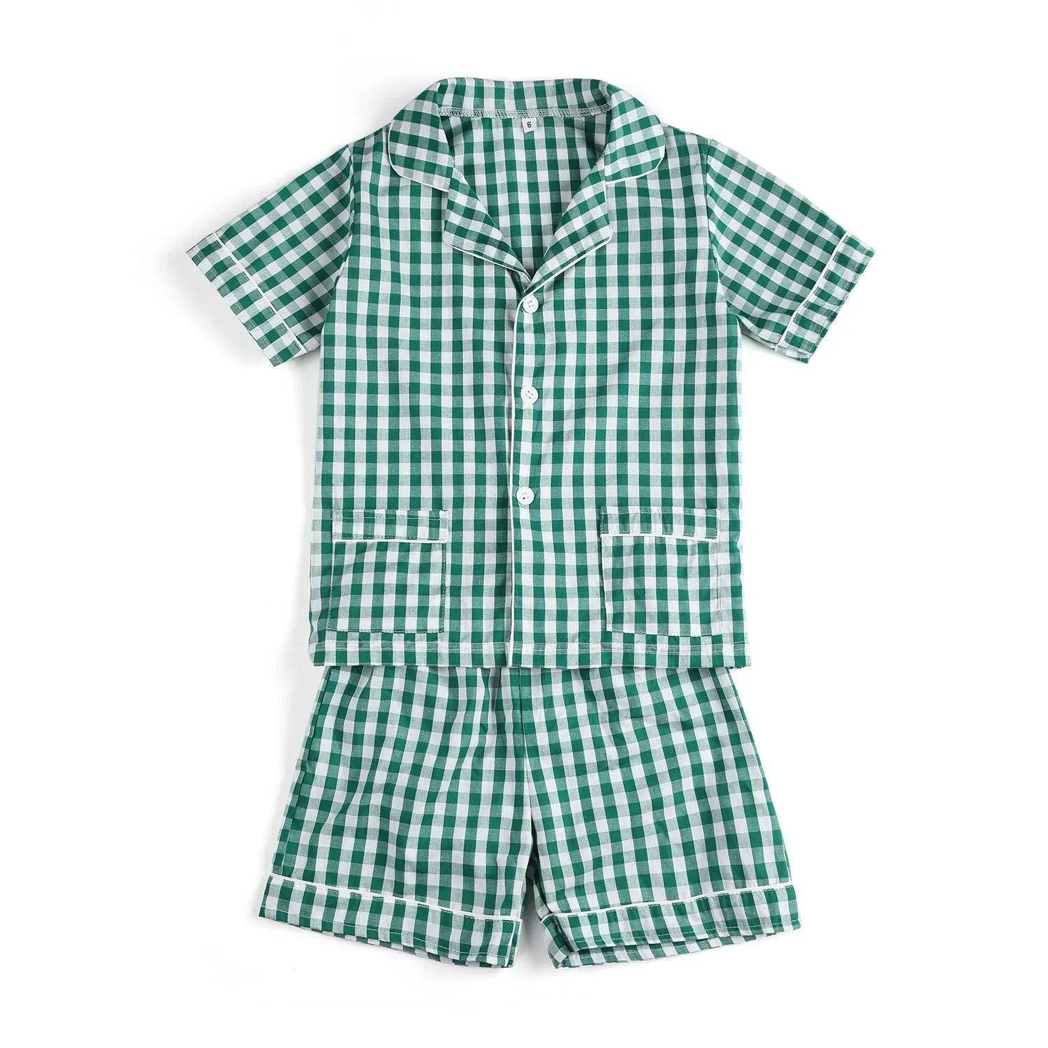 The images showcase the pajamas' charming designs, featuring delightful patterns like stripes and plaids. The button-up top and elastic waistband shorts ensure easy dressing and a snug fit, making these pajamas both adorable and practical for active toddlers and young boys.