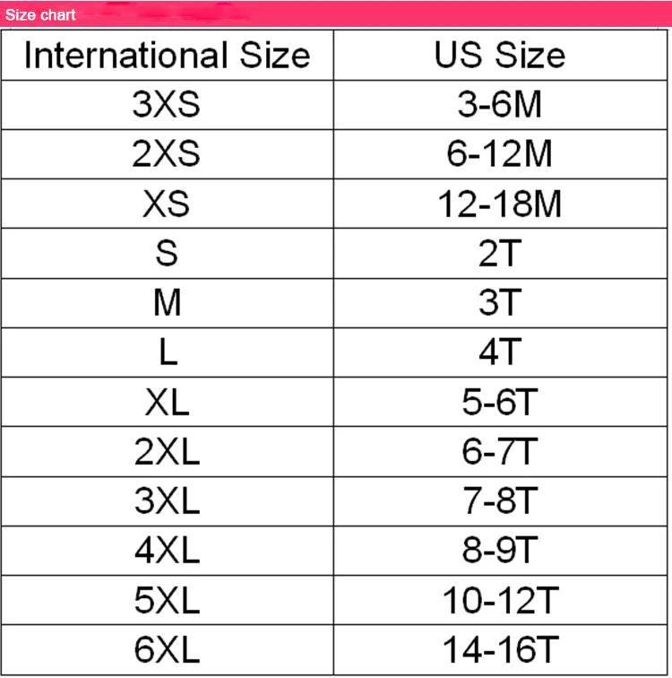 International Size US Size 3XS 3-6M XS 6-12M S 12-18M M 2T L 3T XL 4T 2XL 5-6T 3XL 6-7T 4XL 7-8T 5XL 8-9T 6XL 10-12T 7XL 14-16T