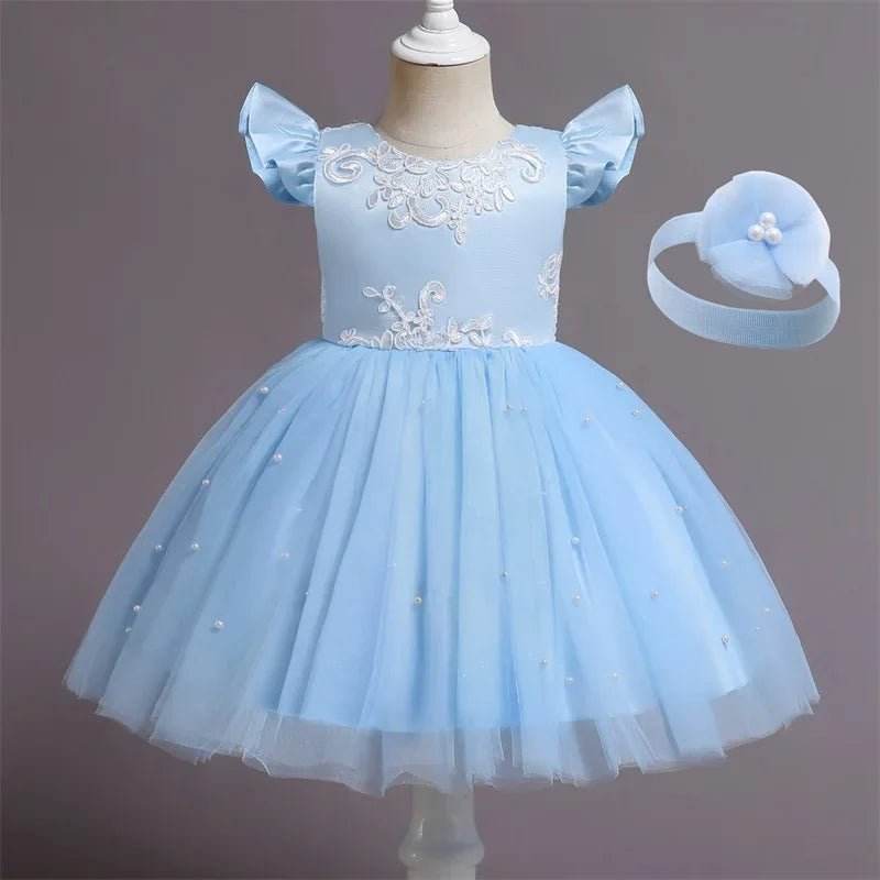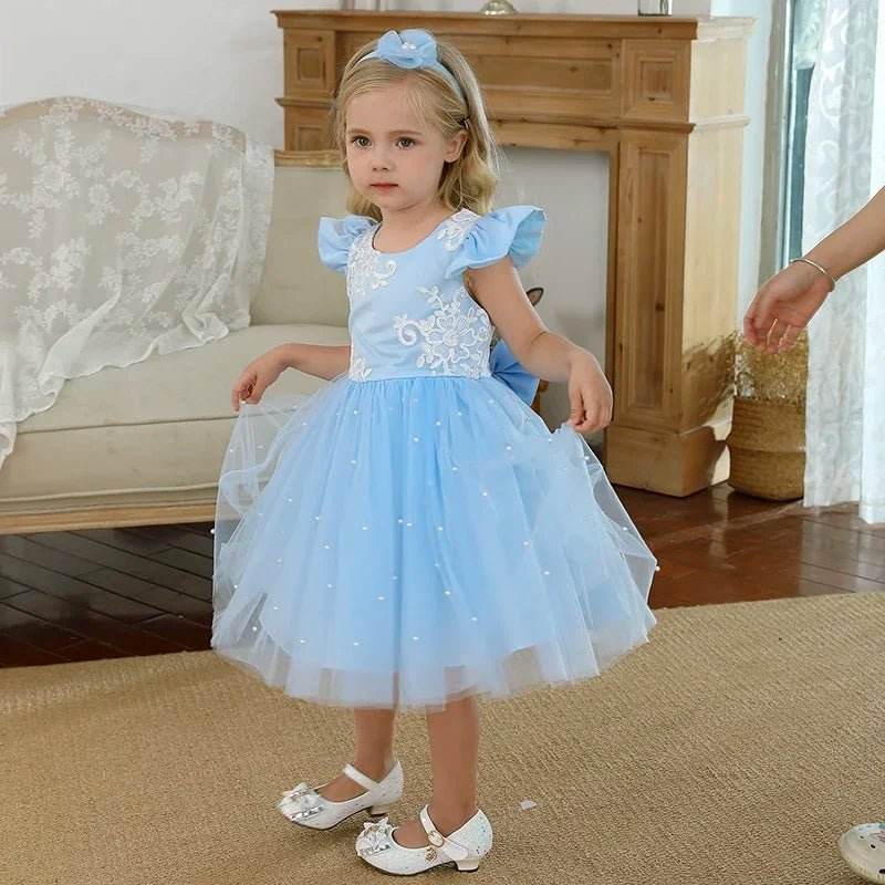 Baby Blue Pink Lace Floral Birthday Girl Party Dress