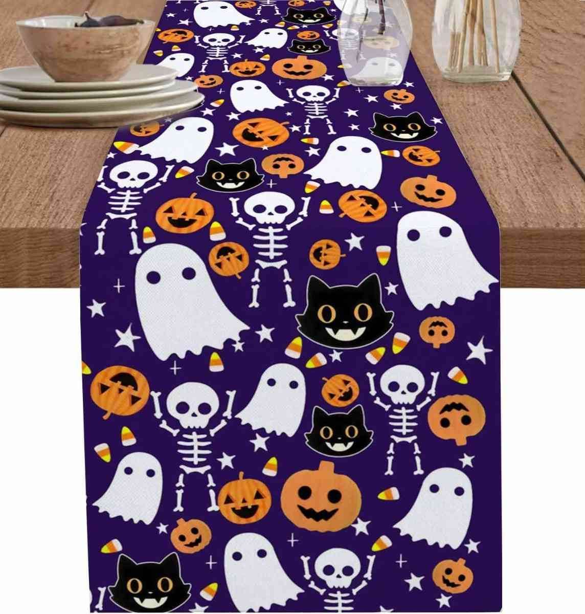 Halloween Pumpkin Ghost Skull Cat Linen Table Runner