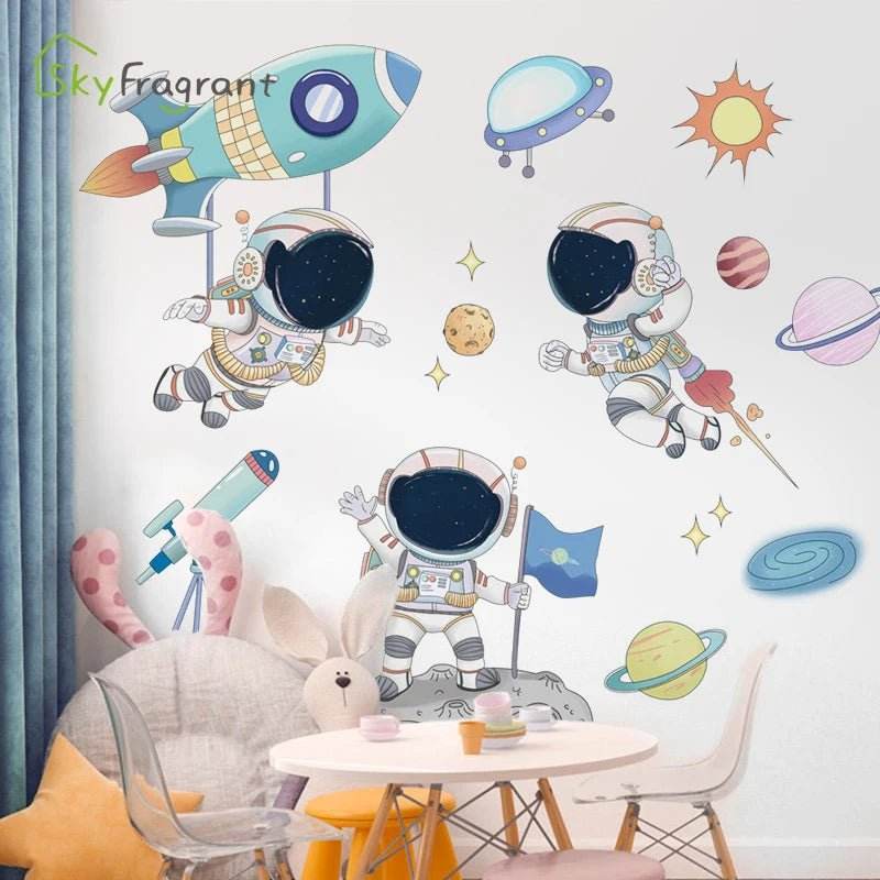 The images showcase a delightful scene of astronauts floating among planets and stars, with telescopes and rockets adding to the space theme. These stickers bring a sense of adventure and exploration, making them a perfect addition to any child's room.