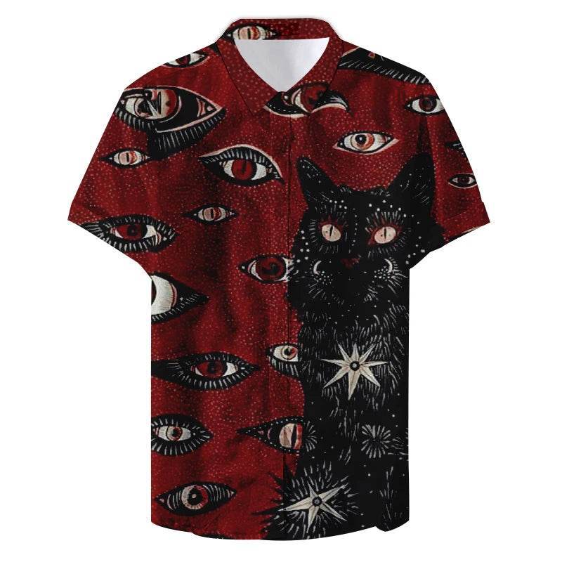 Available in striking colors like deep blue and vibrant red, each shirt showcases a captivating pattern of eyes and stars, with a mysterious black cat taking center stage. The 3D effect adds depth and intrigue, making it a conversation starter wherever you go.