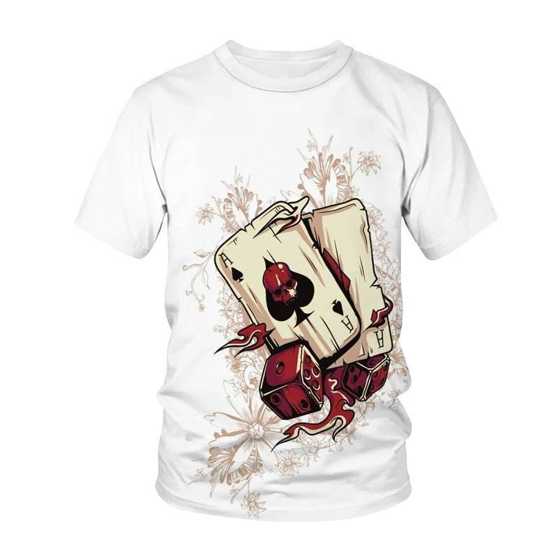 The shirt showcases bold graphics, including vivid poker elements like cards and dice, set against a dynamic background. Available in a range of colors, including classic black and white, it caters to various style preferences. The 3D effect adds depth and intrigue, making it a conversation starter.