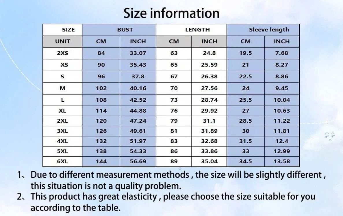 Available in a wide range of sizes from S to 6XL, this tee is designed to fit everyone. The size chart provides detailed measurements in both centimeters and inches, ensuring you find the perfect fit. With great elasticity, this shirt adapts to your body for maximum comfort.
