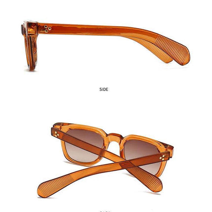 Crafted with precision and attention to detail, these sunglasses feature a retro square frame adorned with rivet accents, adding a touch of vintage charm. The sturdy construction ensures durability, making them a reliable accessory for any occasion. Choose from two lens colors: Black Deep Purple and Orange Brown, to match your personal style.