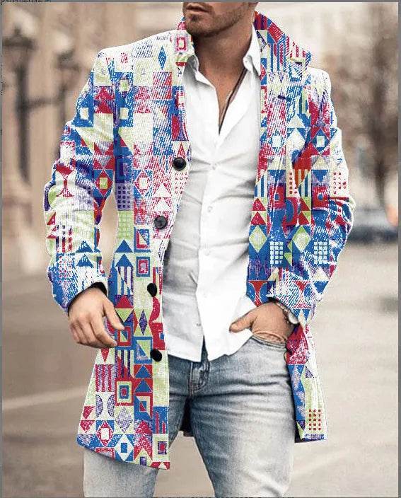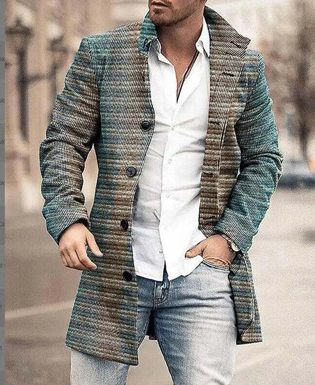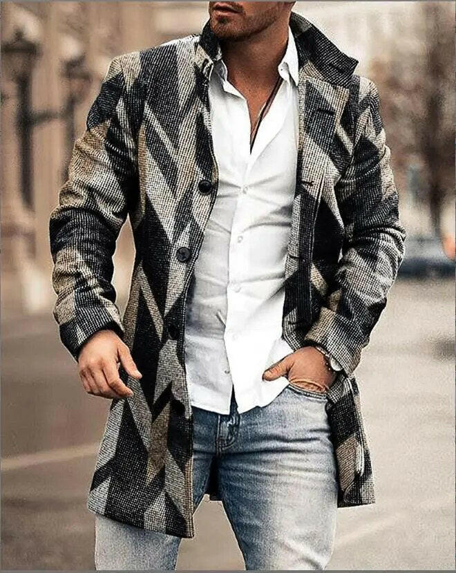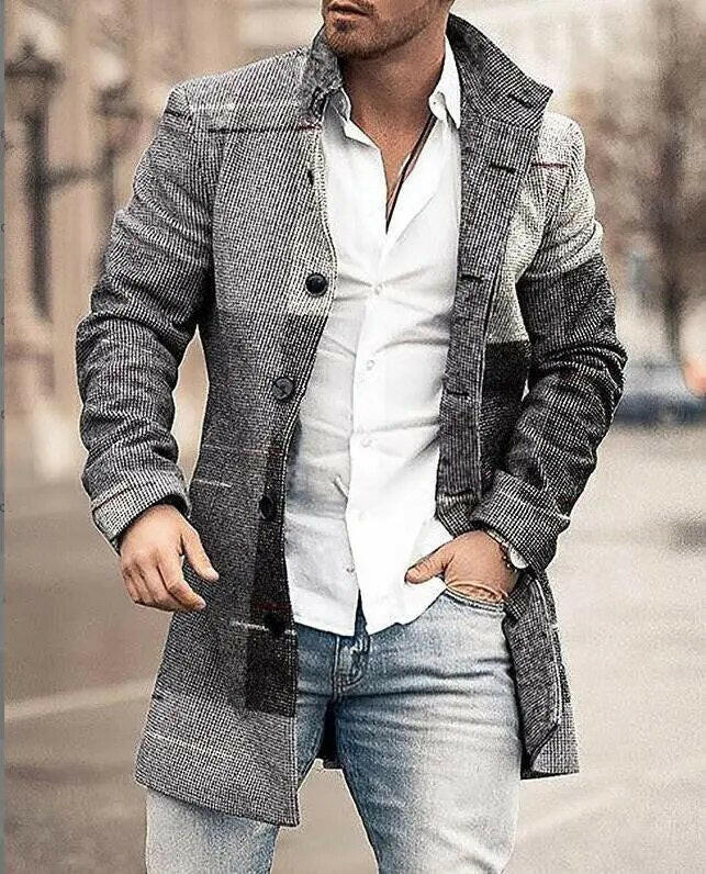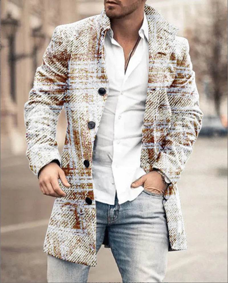 The images showcase the coat's striking appearance, highlighting its textured fabric and tailored fit. The coat pairs perfectly with both formal and casual attire, making it a versatile piece that complements any outfit. Its modern design and practical features make it a standout choice for fashion-conscious men.