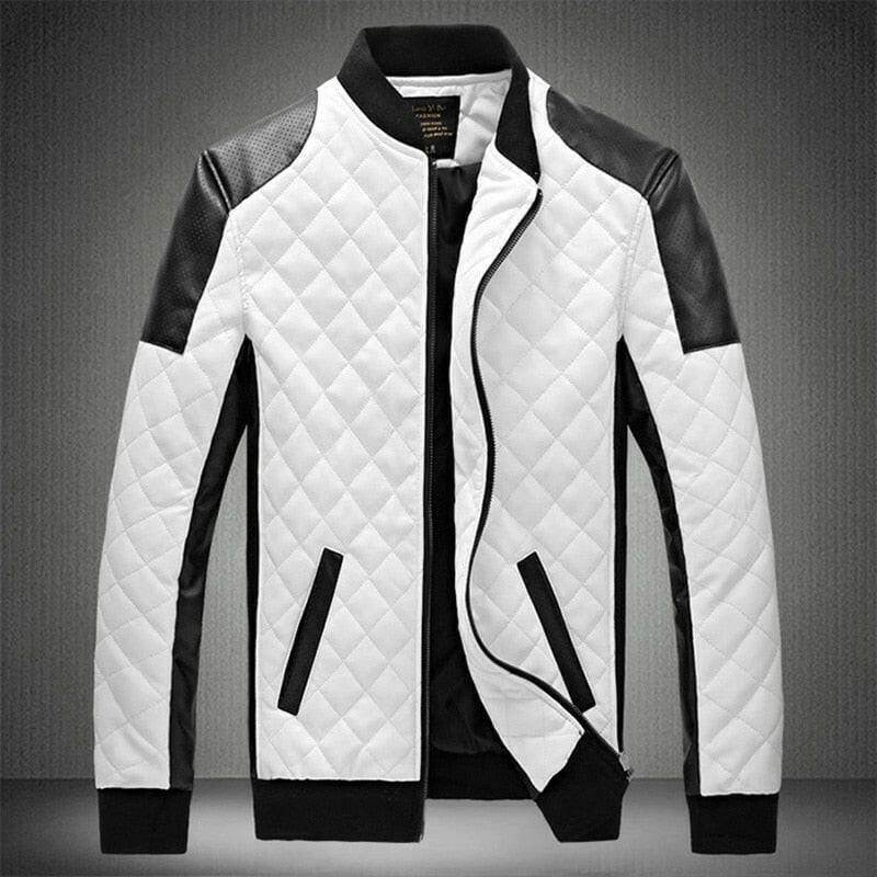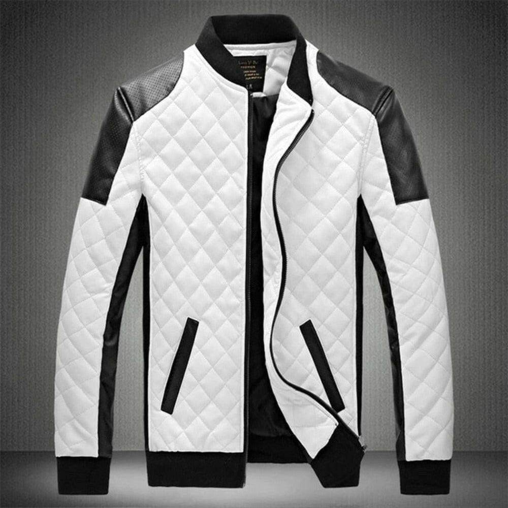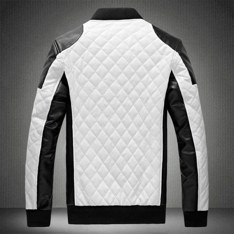 The jacket's striking patchwork design combines bold colors like black, white, blue, pink, and red, making it a standout piece in any wardrobe. Its quilted texture adds a touch of elegance, while the contrasting leather patches on the shoulders and sleeves enhance its rugged appeal. Available in sizes ranging from M to 5XL, it ensures a perfect fit for everyone.