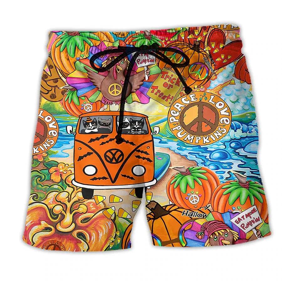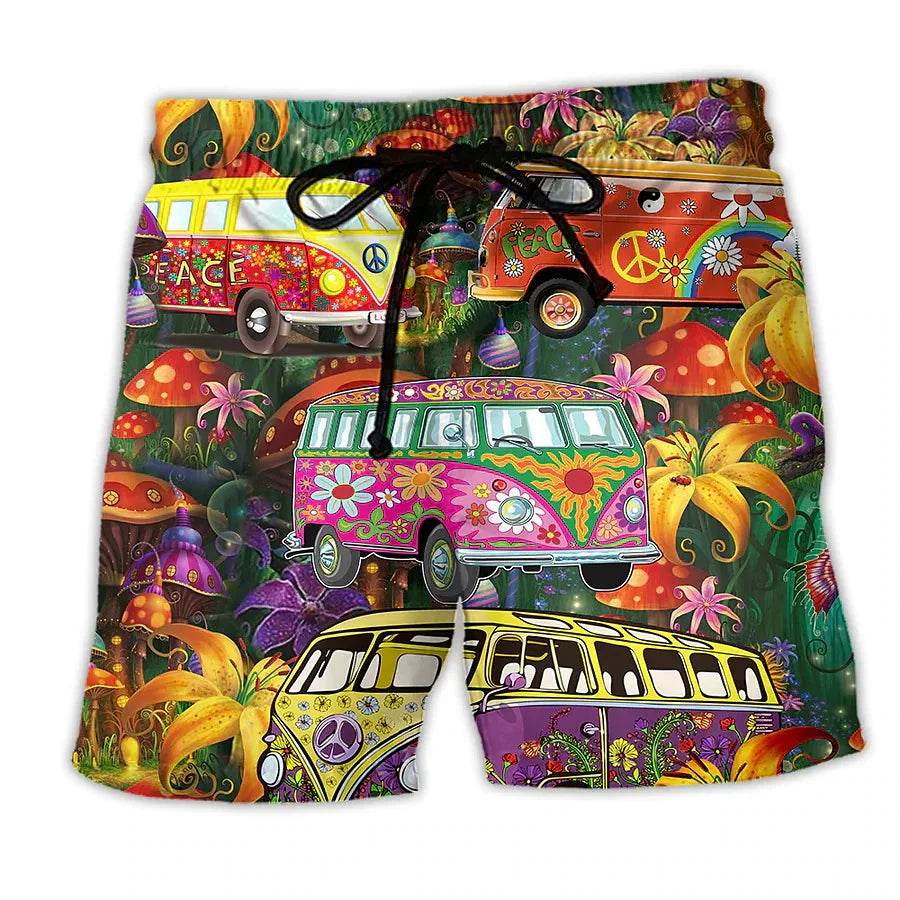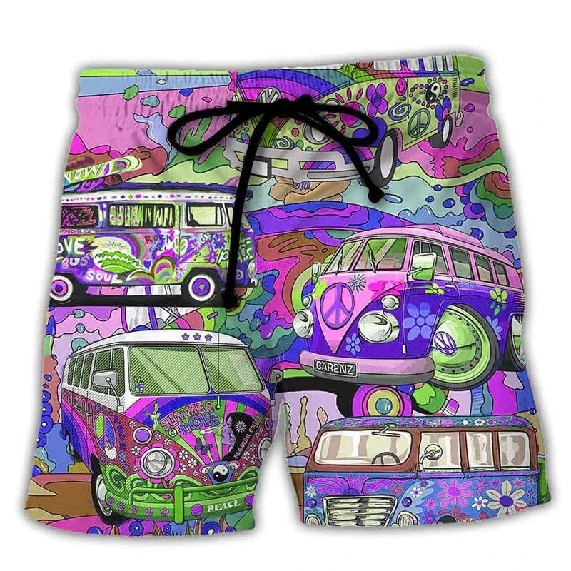 The boardshorts feature a vibrant, eye-catching design that includes colorful surfboards, playful skeletons, and retro vans, capturing the essence of a fun beach lifestyle. The intricate artwork adds a playful twist, making these shorts a must-have for any beach enthusiast.