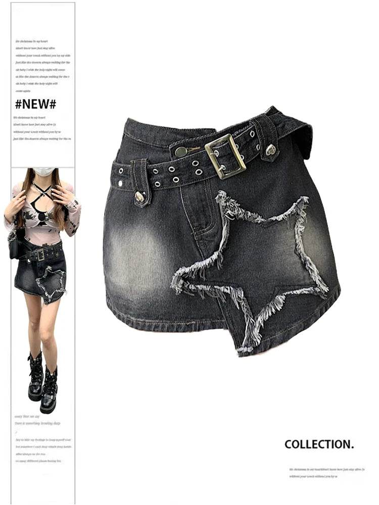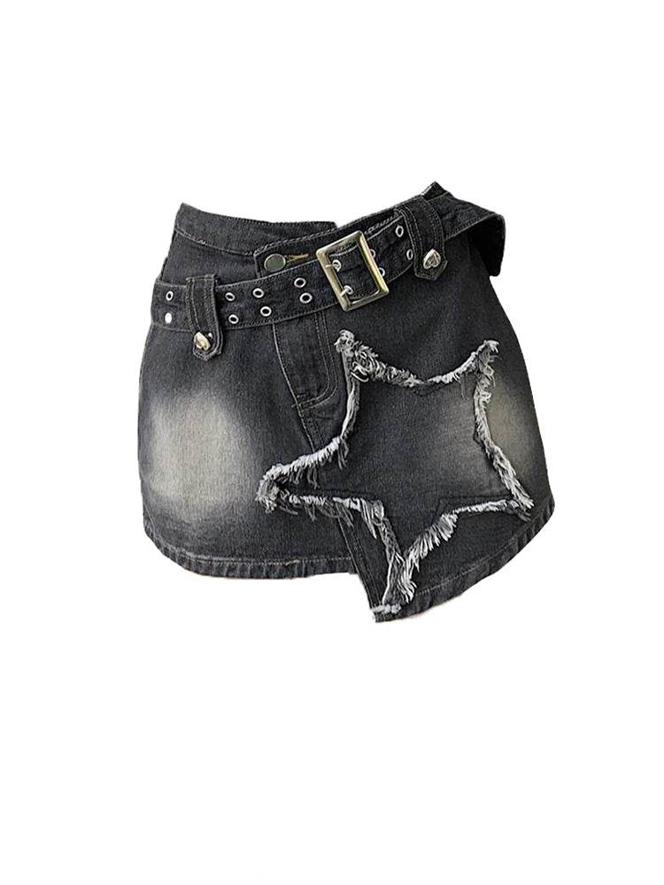 The skirt features an asymmetrical silhouette with a striking star-shaped frayed detail, adding a bold statement to your wardrobe. The above-knee length and empire waistline create a flattering A-line shape that suits various body types. The included belt enhances the overall look, giving it a chic, gothic vibe.