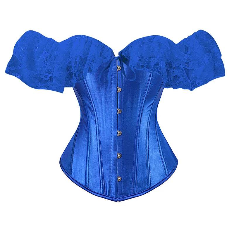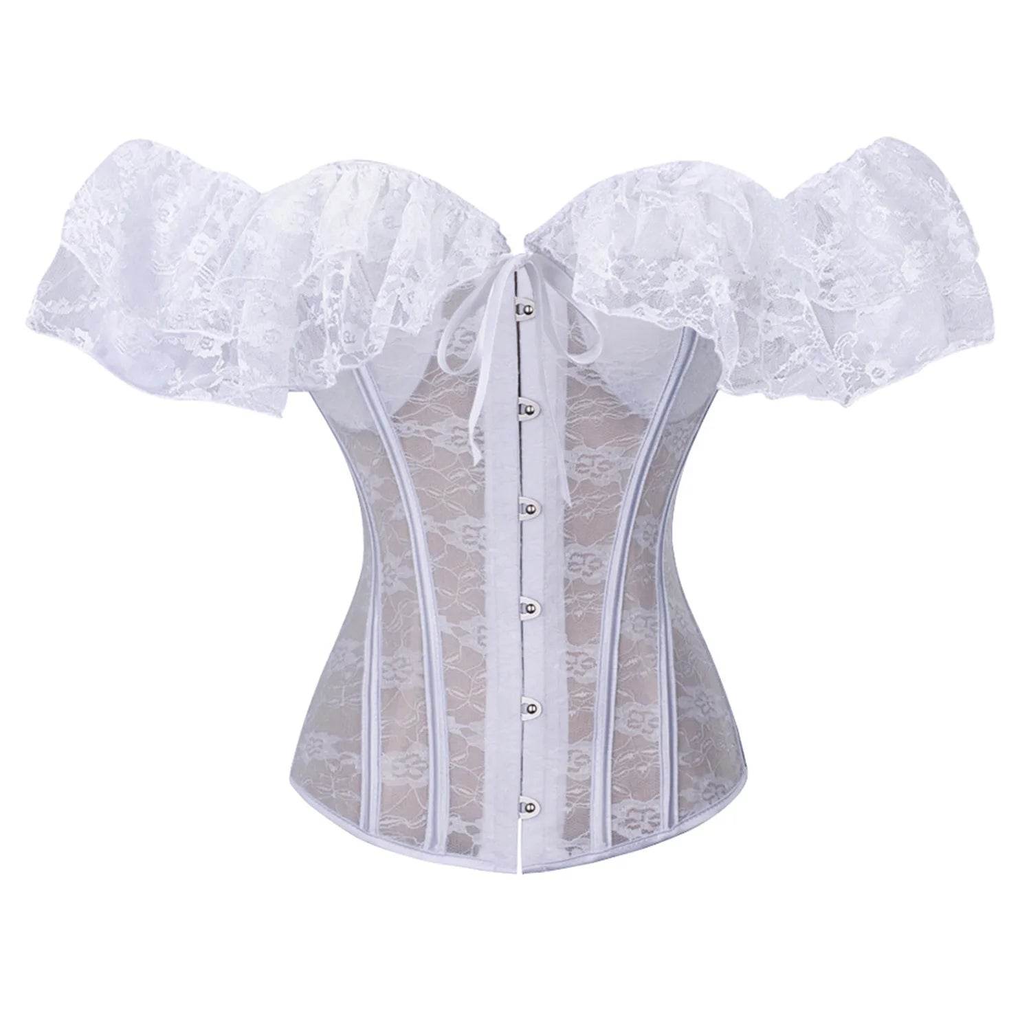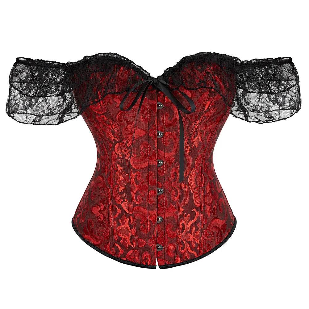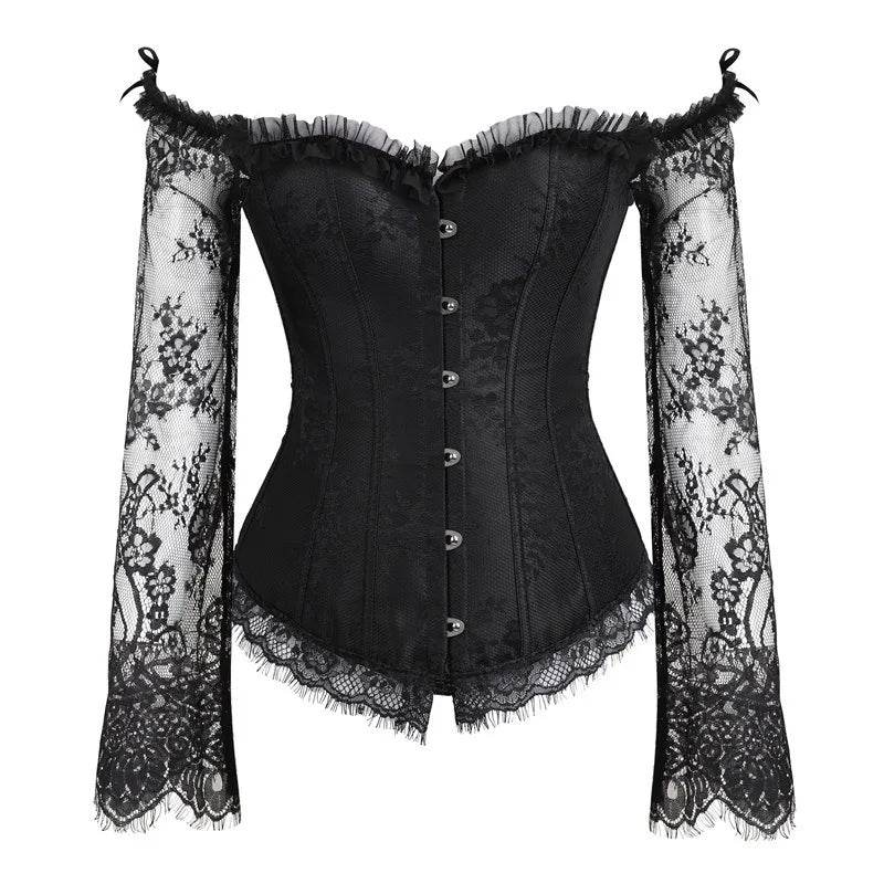 The images showcase the corset's exquisite design, highlighting its lace sleeves and structured bodice. The off-shoulder style adds a touch of elegance, making it suitable for both formal and casual settings. Pair it with a flowing skirt or your favorite jeans for a versatile look that turns heads.