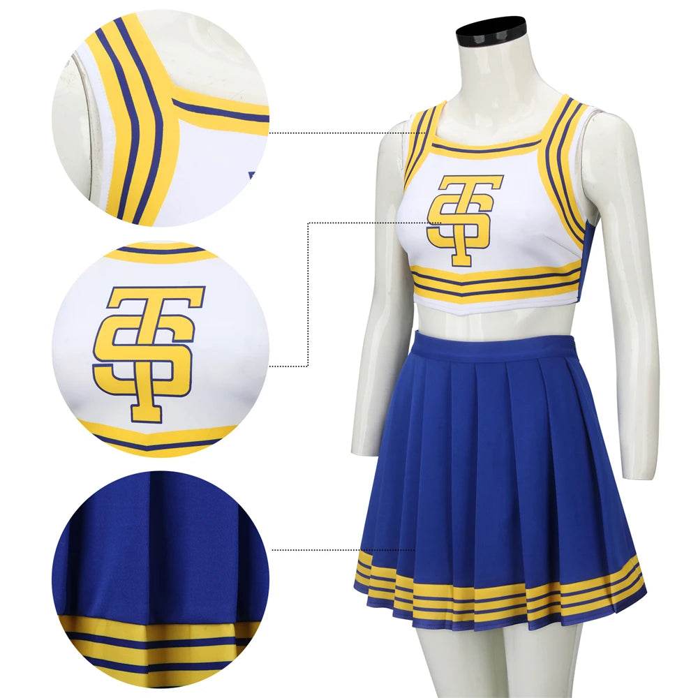 The images showcase a vibrant blue cheerleader outfit with a pleated skirt and matching top, complete with colorful pom-poms. This eye-catching ensemble is sure to make you the center of attention at any event.