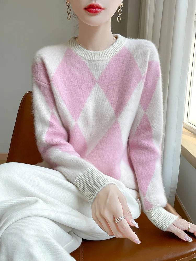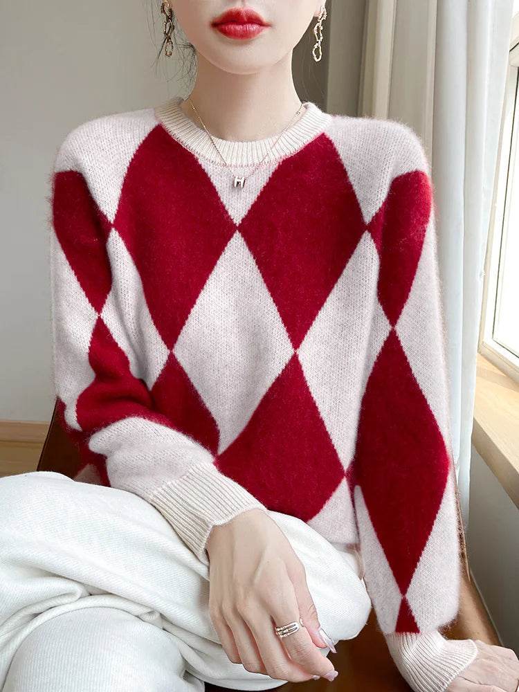 The sweater features a flattering crewneck cut and a classic plaid design that exudes sophistication. Available in a range of colors including red, beige, and pink, it allows you to express your personal style effortlessly. Whether you're dressing up for a business meeting or keeping it casual for a day out, this sweater adapts to your needs.