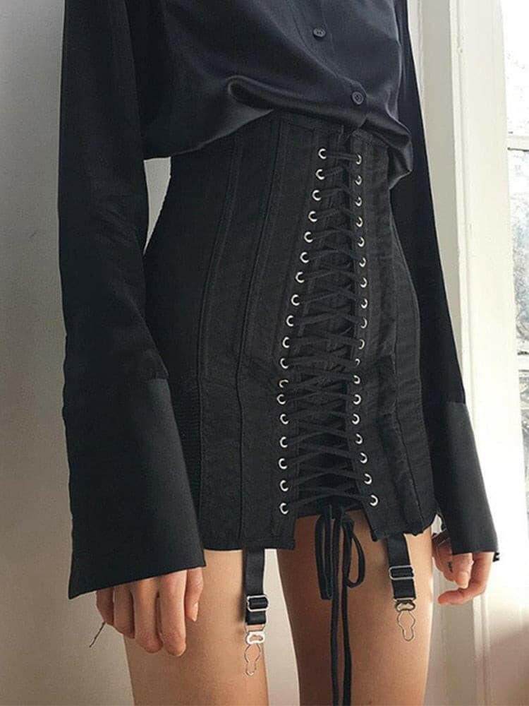 The skirt's patchwork design is a bold statement, combining gothic elements with a contemporary twist. The lace-up front not only adds a touch of drama but also allows for a customizable fit, ensuring you feel as confident as you look. Whether you choose the classic black or the subtle beige, this skirt is a versatile addition to your wardrobe.
