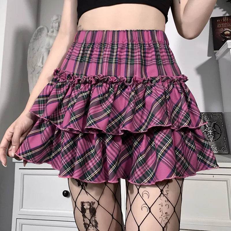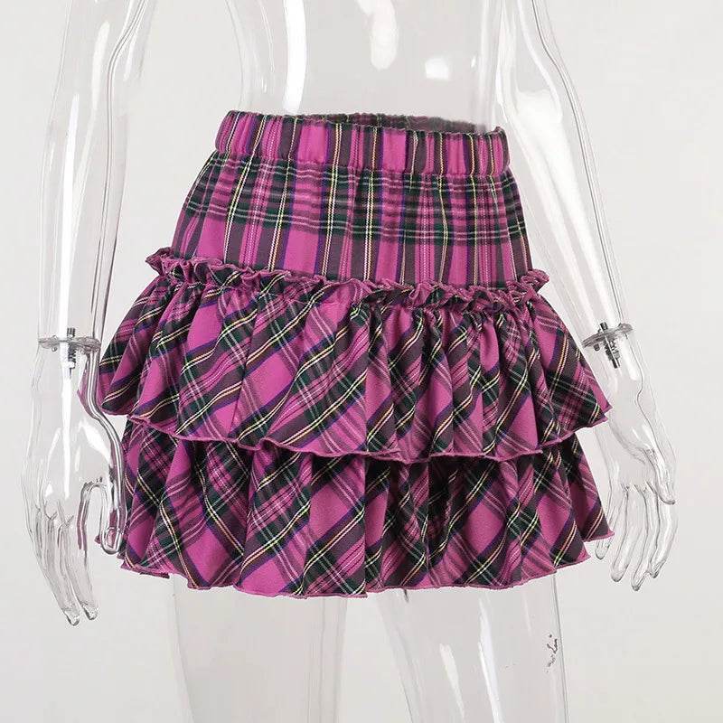 Crafted with exquisite attention to detail, this skirt features a high-waist fit that flatters your silhouette. The bold pink plaid pattern adds a pop of color, while the layered ruffles bring a playful yet sophisticated touch. It's perfect for expressing your unique style, whether you're heading to a party or just out for a casual day.