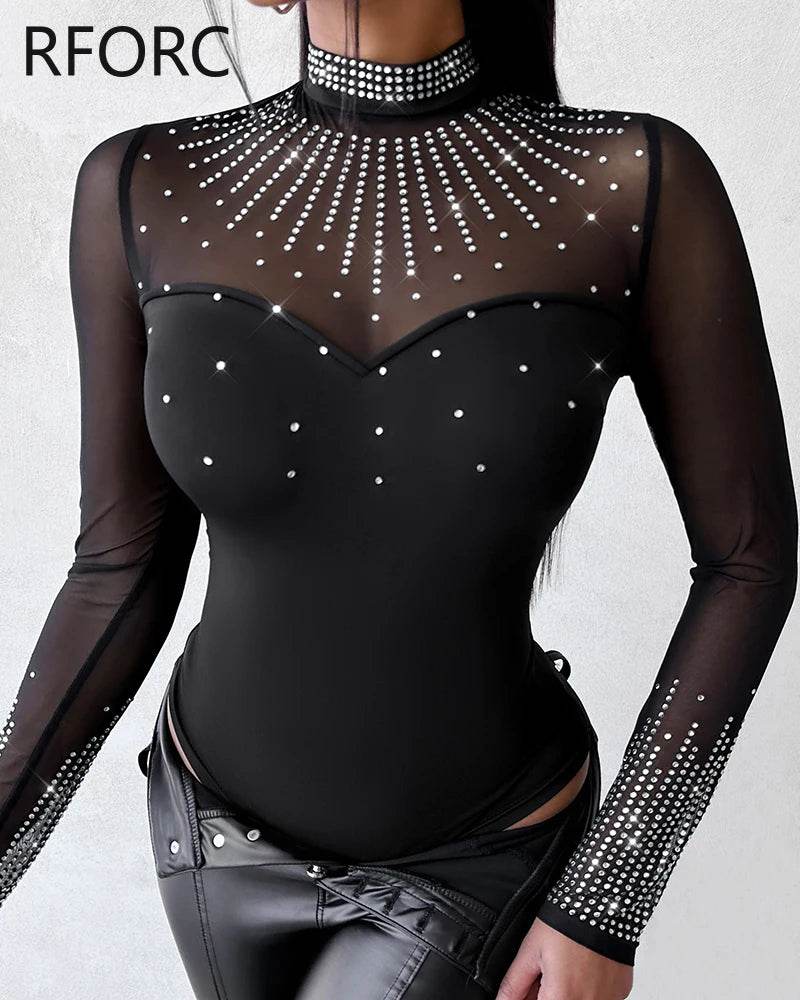 The images showcase the bodysuit's exquisite design, highlighting the intricate rhinestone detailing that adds a glamorous touch. The sheer mesh fabric creates a stunning contrast, enhancing the overall look and feel of the piece. This bodysuit is not just clothing; it's a statement of style and confidence.