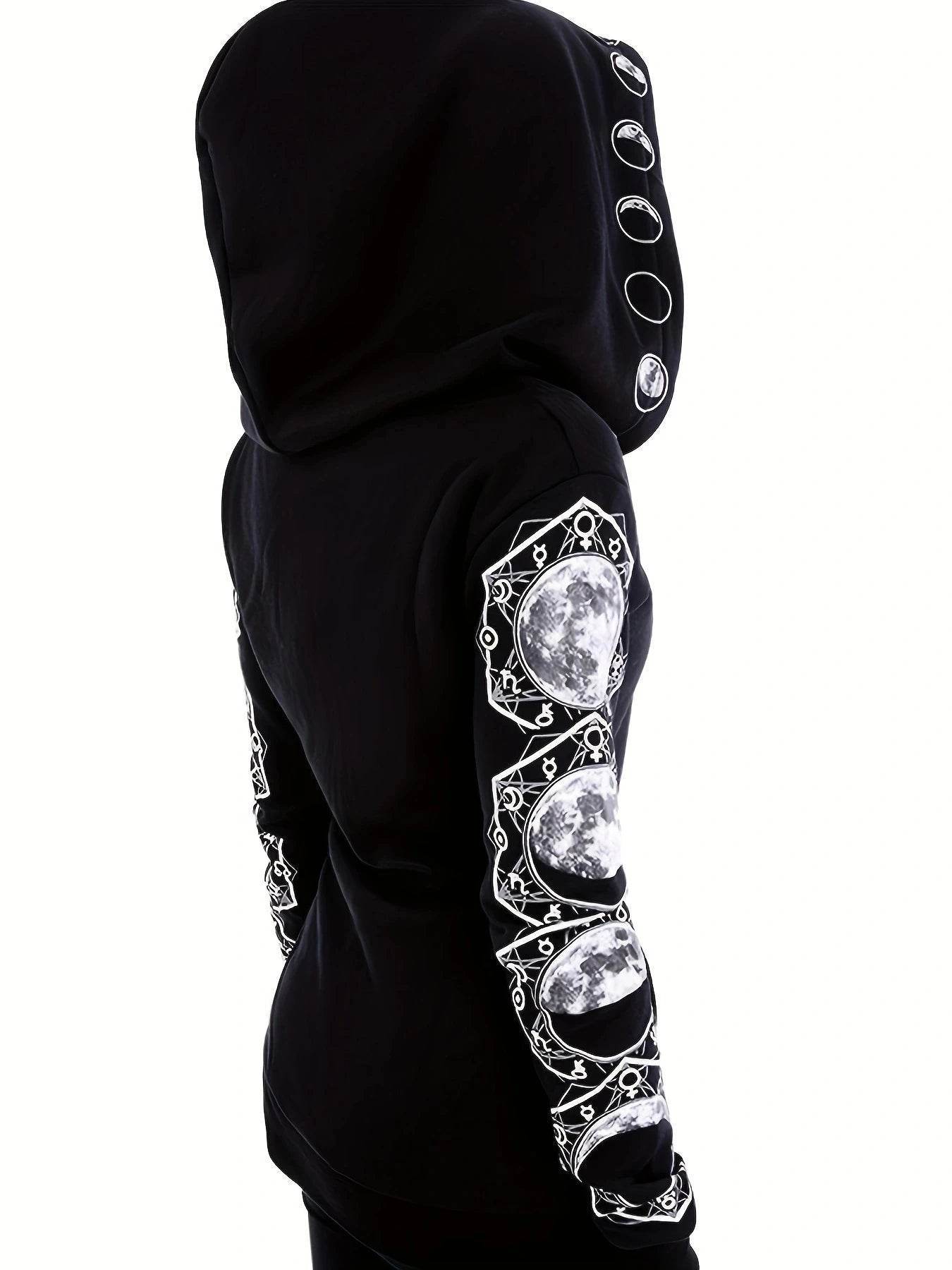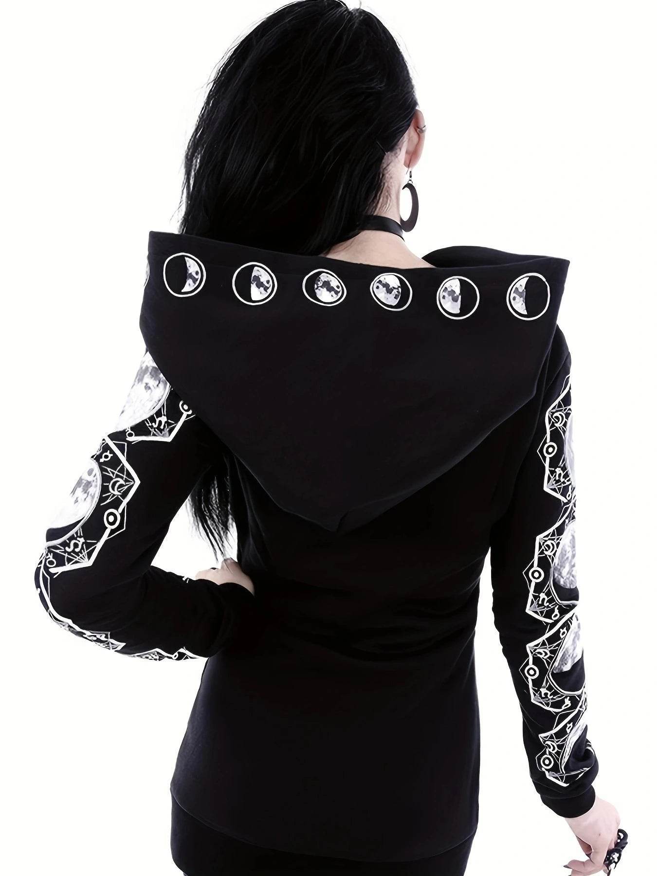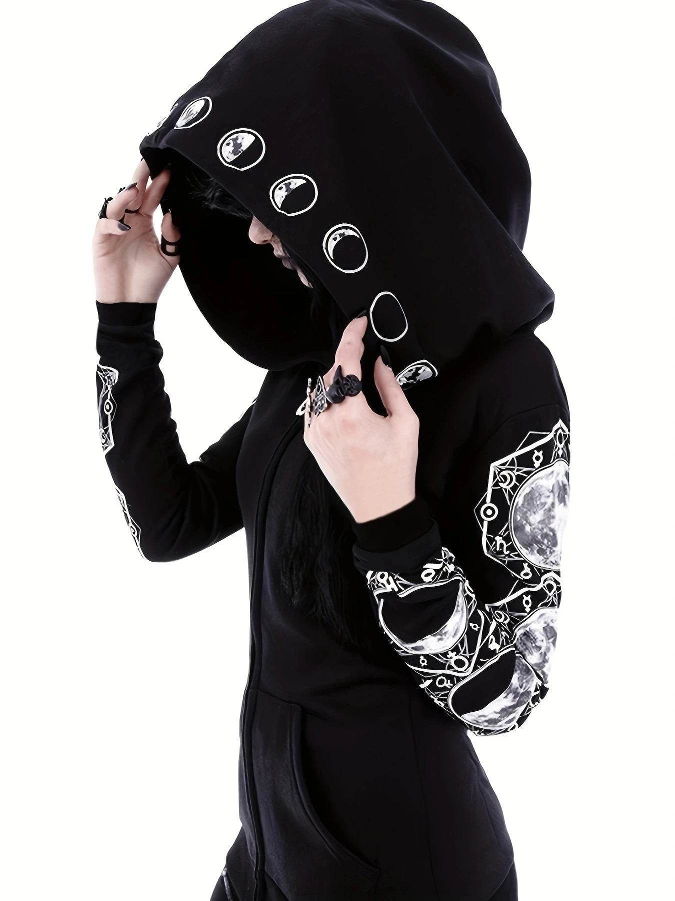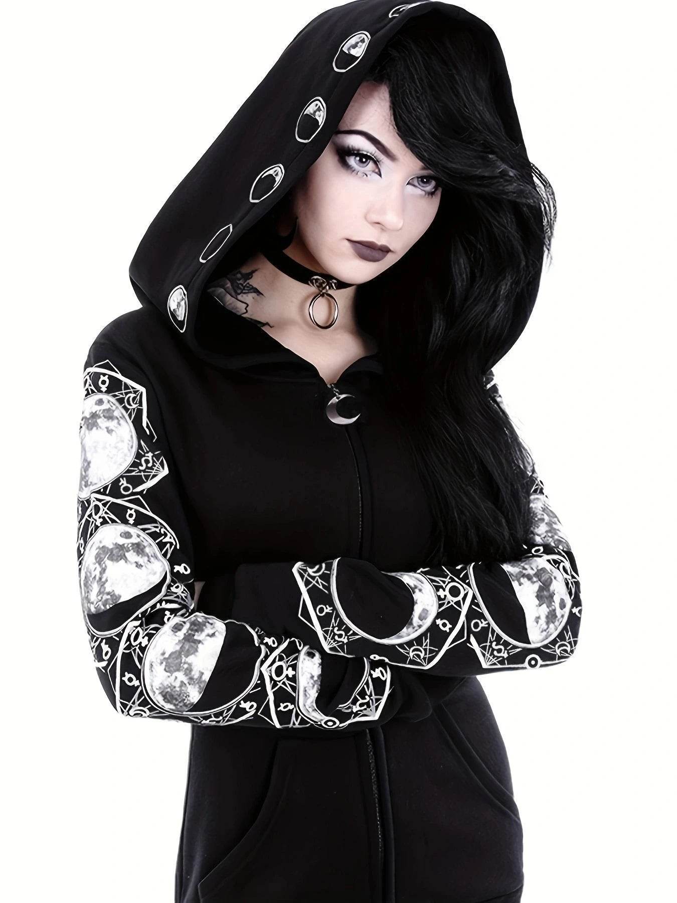 Crafted from high-quality materials, these hoodies ensure warmth and comfort throughout the day. The intricate moon patterns on the sleeves and hood add a distinctive gothic flair, making it ideal for casual outings or cozy nights in. Available in a range of colors including black, blue, pink, red, and white, there's a perfect shade for every mood.