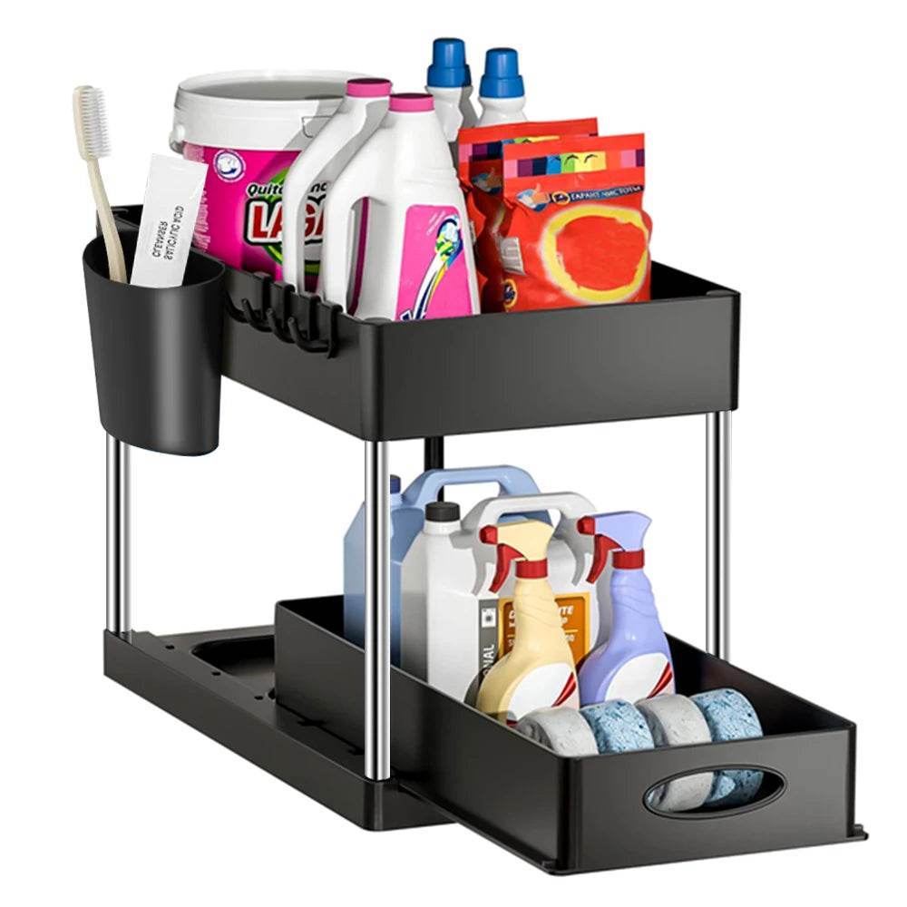 Upgrade your kitchen today with the 2 Tier Under Sink Organizer and enjoy a clutter-free, organized space that makes cooking and cleaning a breeze.