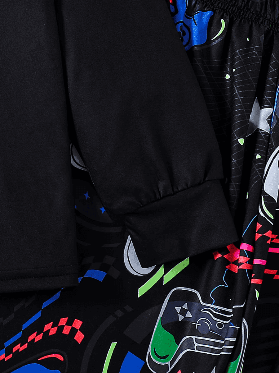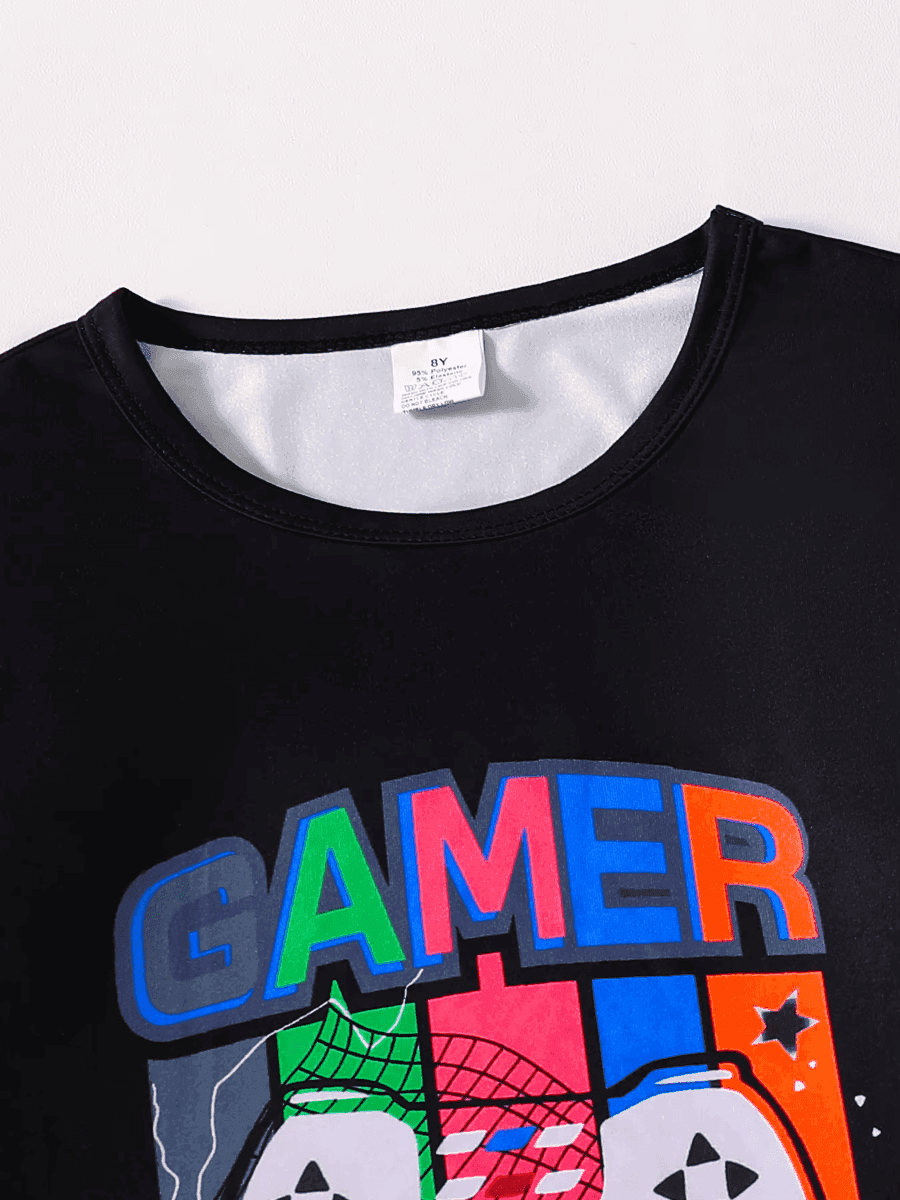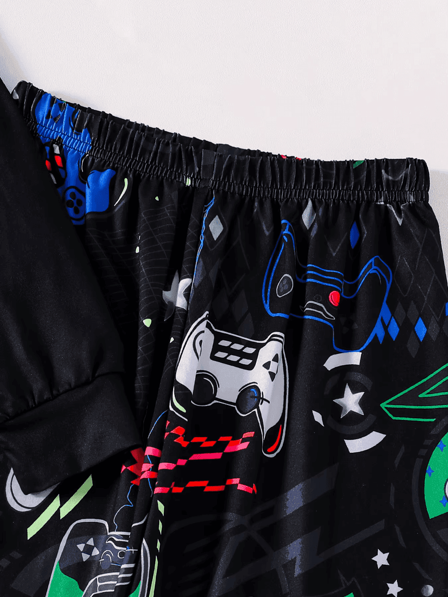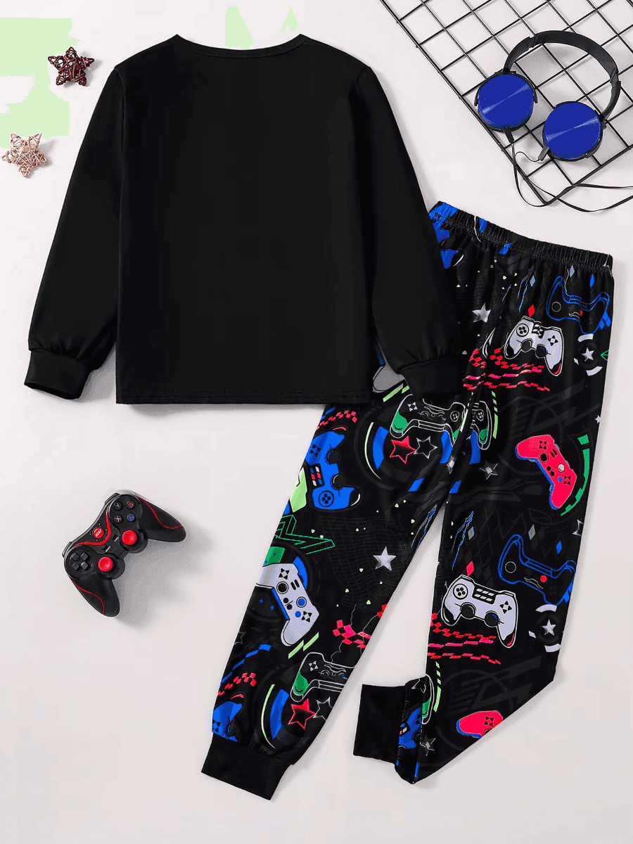 The pajama set includes a black long-sleeve top with a colorful "GAMER" graphic, paired with matching pants adorned with playful game controller designs. The luminous elements make these pajamas stand out, adding a touch of magic to your child's nighttime routine.