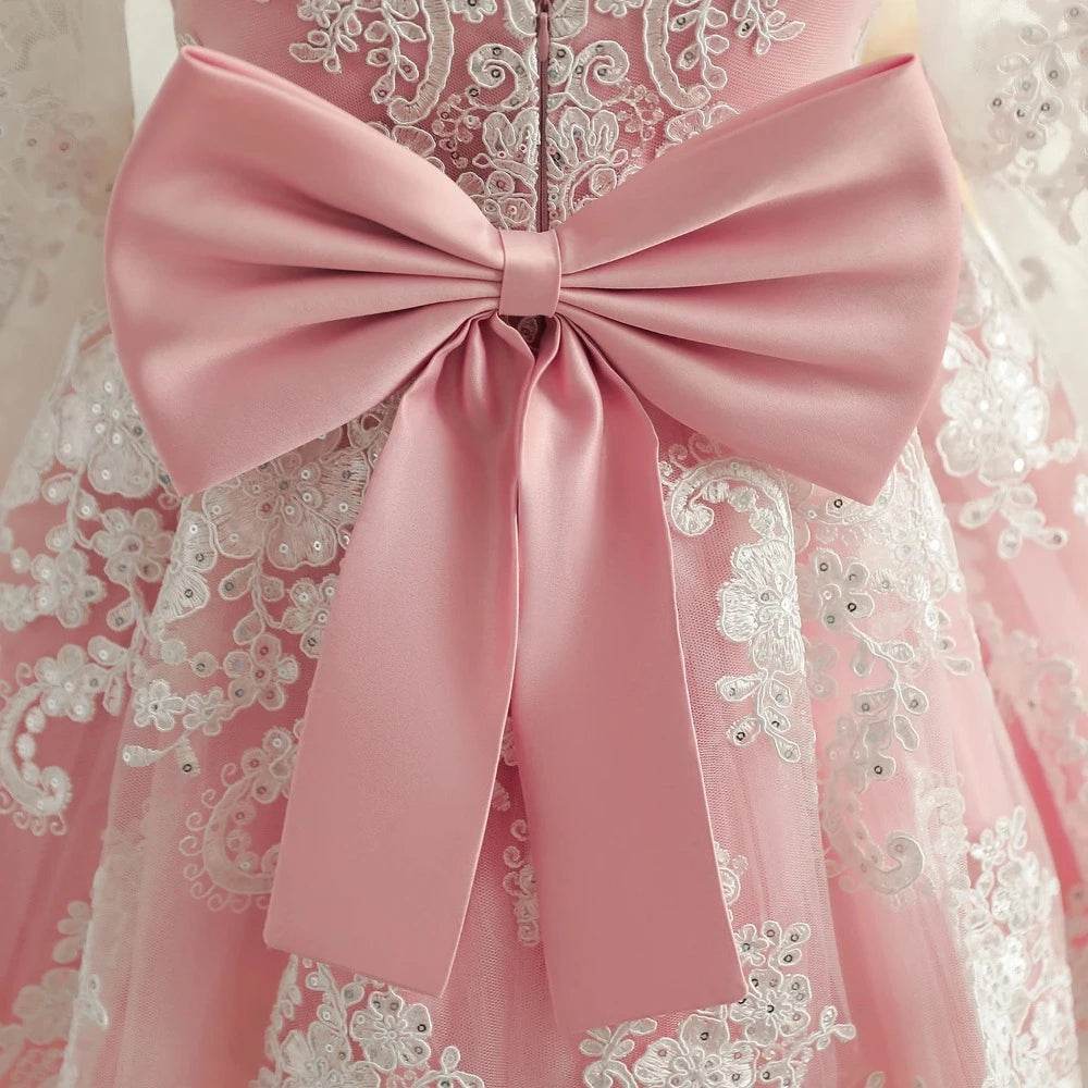 Design: The dress includes a charming bow at the back and delicate lace sleeves, adding an extra touch of elegance.