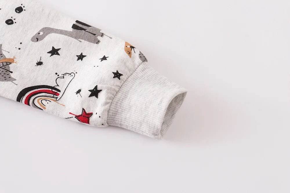 Introducing the Boys Dinosaur Fashion Sweater, a must-have for every little dino enthusiast! Perfect for boys aged 2-7 years, this sweater combines comfort and style effortlessly. Made from a high-quality cotton-polyester blend, it ensures warmth and durability, making it ideal for active play and everyday wear.