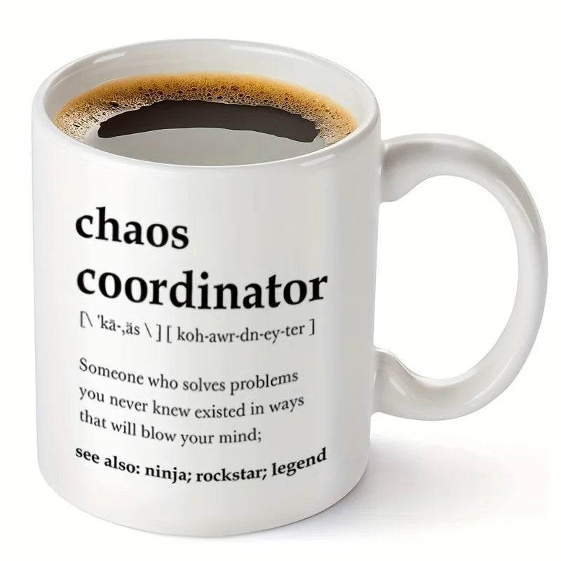 Available in a variety of colors, including classic black and white, these mugs hold between 301-400ml, making them ideal for your morning coffee or afternoon tea. The sleek design features a playful definition of a "chaos coordinator," adding a touch of humor to your daily routine.