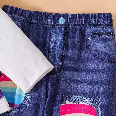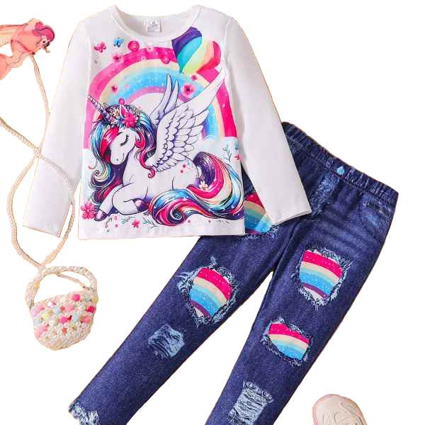 The vibrant colors and playful design of the unicorn and rainbow on the top, paired with the stylish distressed look of the denim jeans, make this outfit a standout choice. The set is completed with a touch of floral embroidery on the jeans, adding an extra layer of charm.