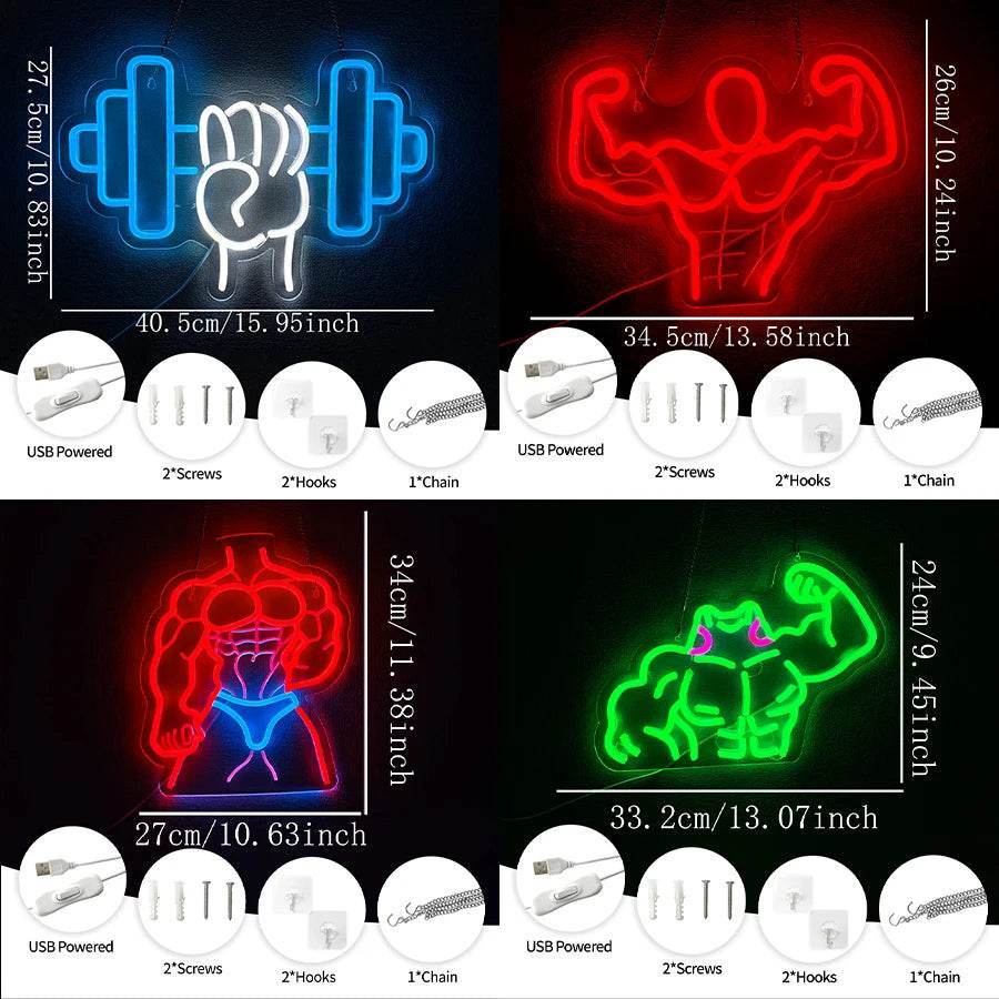 The LED Neon Fitness Gym Wall Sign features bold designs like flexing arms and biceps, adding a powerful visual statement to your gym. Available in multiple colors, including striking reds, blues, and greens, it allows you to customize your space to match your style. The USB-powered feature ensures convenience and adaptability in various settings.