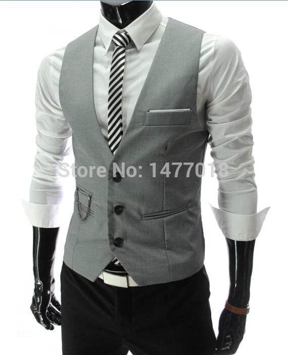 The images showcase the vest's sleek design, featuring a tailored fit that complements the modern man. The waistcoat pairs beautifully with a crisp shirt and tie, as seen in the images, highlighting its ability to elevate any ensemble. The subtle chain detail adds a touch of sophistication, making it a must-have for those who appreciate fine details.