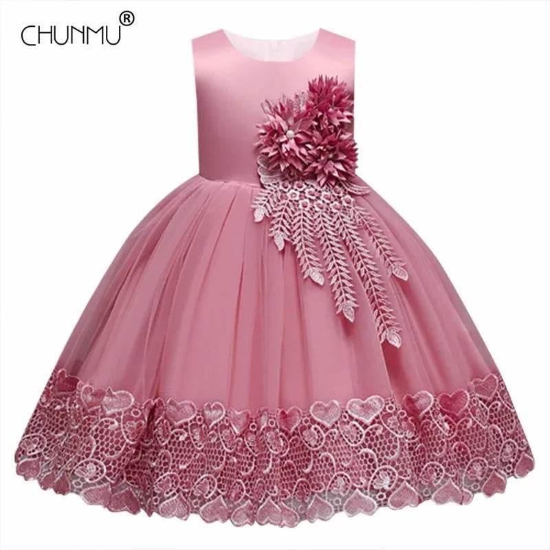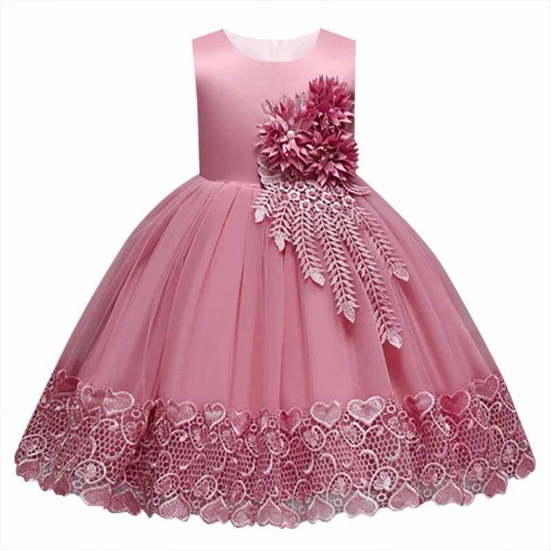 The dress features a beautiful floral embellishment on the bodice, creating a stunning focal point. The full skirt is adorned with intricate lace detailing, adding a whimsical touch that will make your little one feel like a princess. Available in a variety of colors including white, pink, blue, yellow, wine red, green, and purple, you can choose the perfect shade to match the occasion.