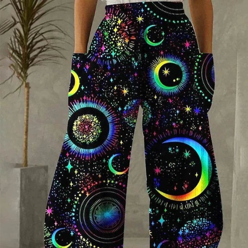 The wide-leg design not only provides a flattering silhouette but also ensures maximum comfort. Made with high-quality materials, these pants are soft and breathable, making them ideal for any occasion. The vibrant galaxy print adds a touch of whimsy and creativity to your wardrobe.