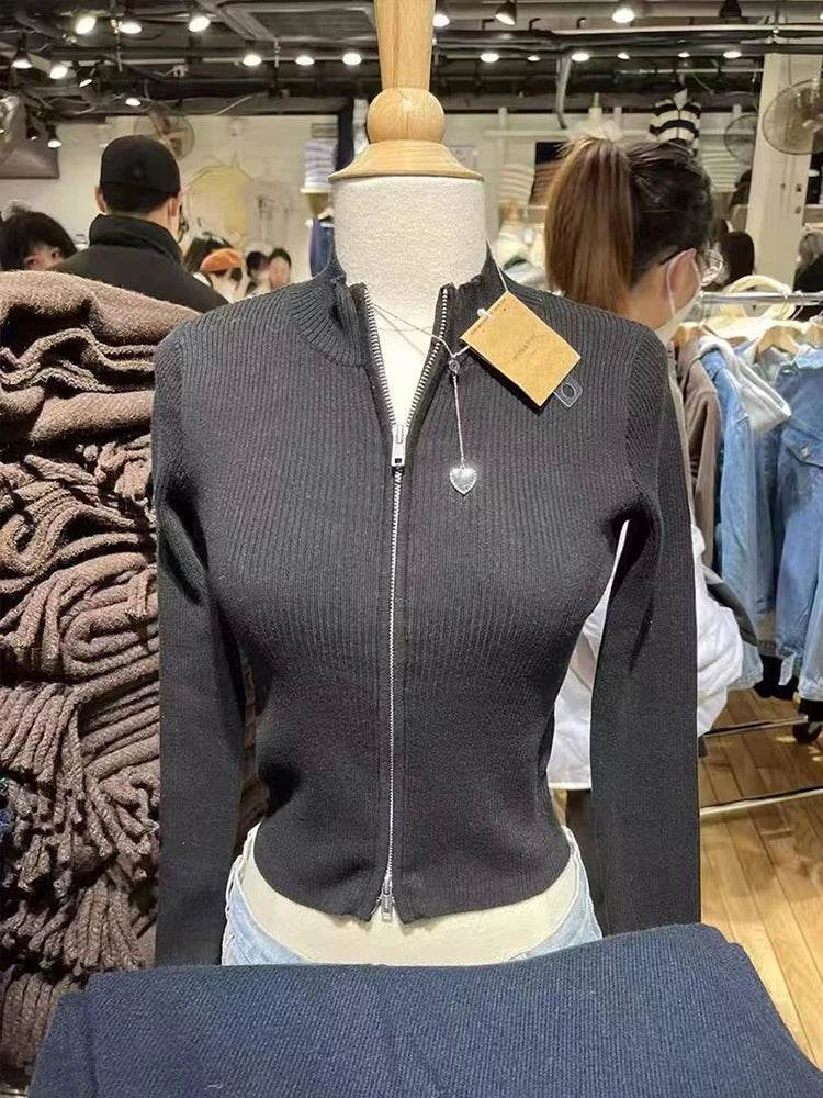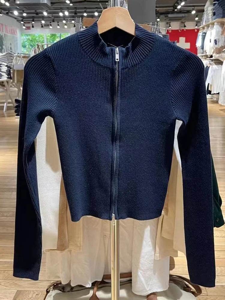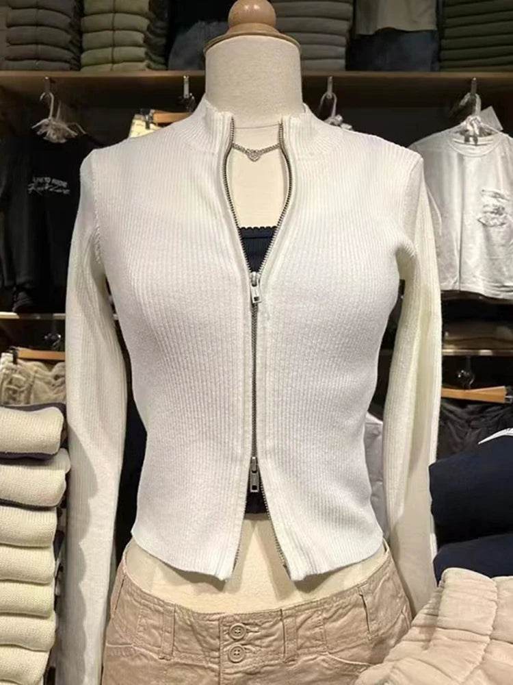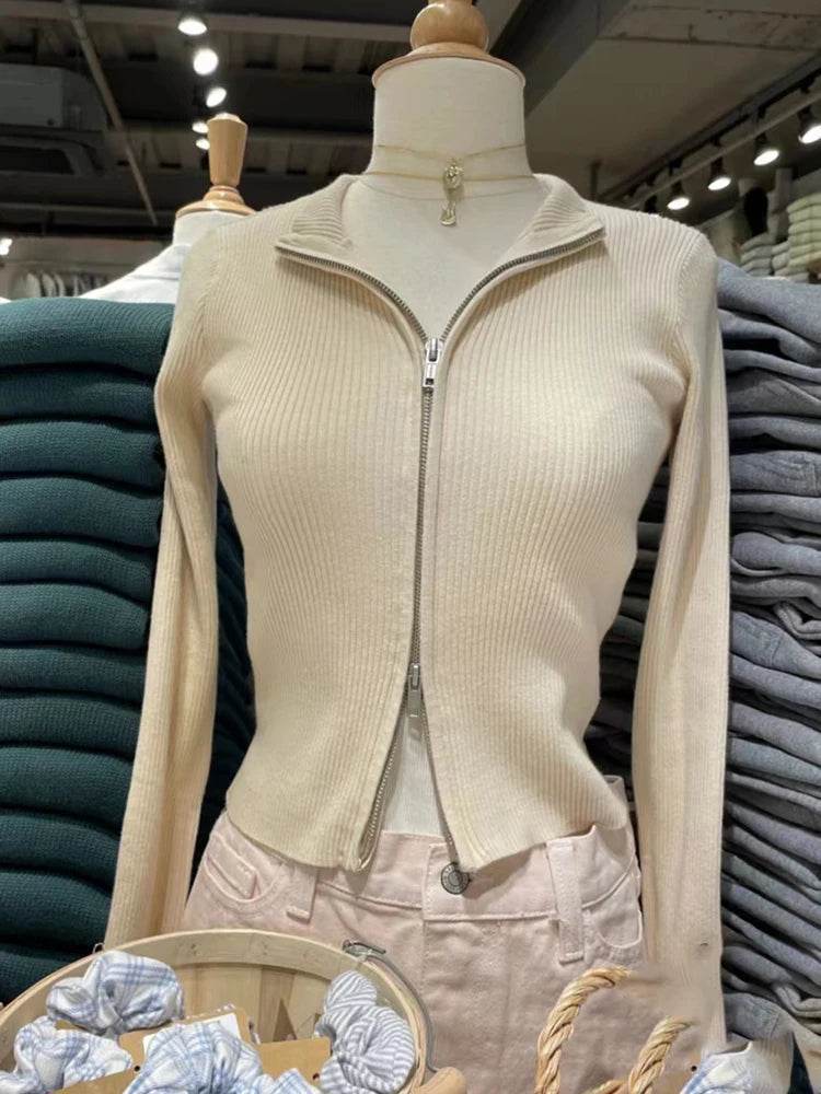 The sweater features a flattering crop top cut that pairs beautifully with high-waisted jeans or skirts. Its ribbed texture adds a touch of sophistication, while the zip-up front allows for easy wear and a customizable fit. Available in classic colors like Navy Blue, Black, White, and Beige, this piece is as versatile as it is stylish.
