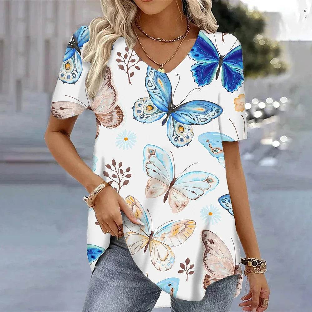 The images showcase the blouse's beautiful butterfly design, with vibrant colors that pop against the fabric. The short sleeves and relaxed fit make it a versatile choice for any season. Pair it with jeans or a skirt for a chic and effortless look.