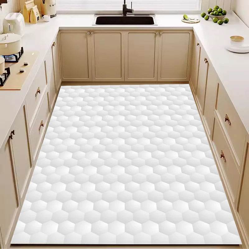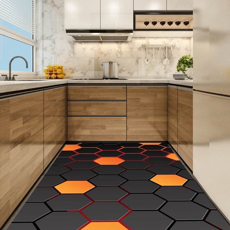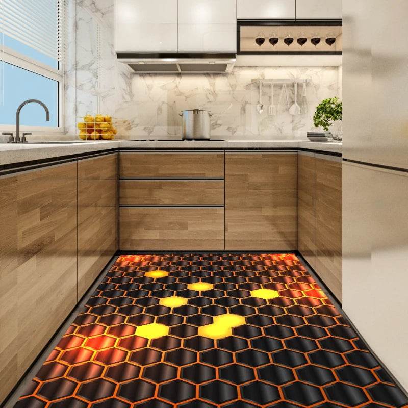 The images showcase the mat's captivating hexagonal patterns that create a striking visual effect, enhancing any kitchen's aesthetic. The bold colors and intricate design make it a standout piece that complements both modern and classic interiors.