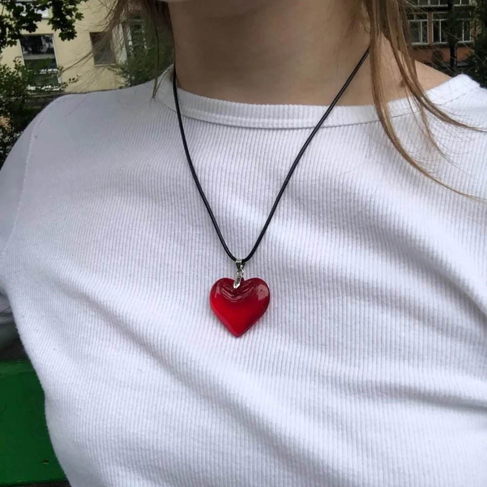 The necklace is showcased beautifully in the images, highlighting its vibrant red heart pendant against a simple black cord. This contrast enhances its gothic charm, making it a standout piece in any jewelry collection. The necklace is shown worn with both casual and more detailed outfits, demonstrating its versatility and ability to elevate any look.