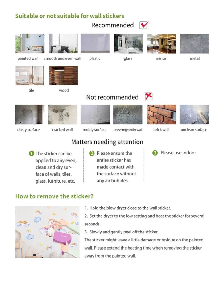 This wall sticker is perfect for smooth, even surfaces like painted walls, glass, and tiles. It's easy to apply and remove, making it a versatile choice for any room. Simply follow the included instructions for a hassle-free setup.