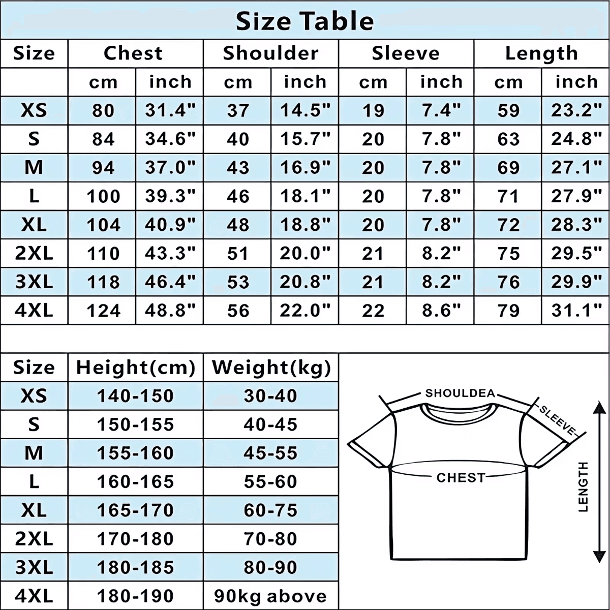 With sizes ranging from XS to 4XL, finding the perfect fit is a breeze. Check out our detailed size table to ensure you get the right size for maximum comfort. Whether you prefer a snug fit or a more relaxed style, this shirt has got you covered.