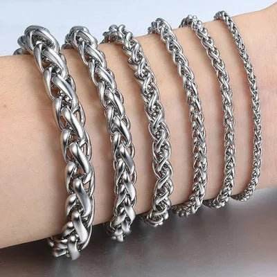 The bracelet's polished silver finish catches the light beautifully, making it a striking addition to any ensemble. The images showcase the bracelet's intricate chain design, highlighting the different thickness options available. Whether you prefer a bold 6mm chain or a more subtle 3mm, each option offers the same level of elegance and durability.