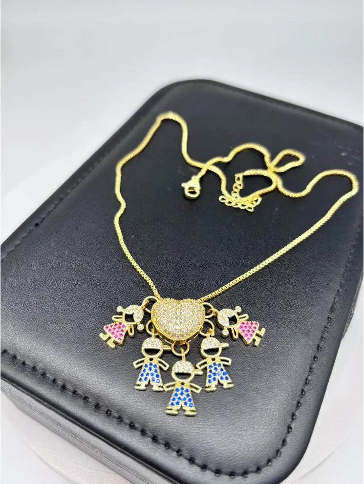 Crafted with precision, the necklace features a shimmering heart adorned with sparkling cubic zirconia, symbolizing the love and warmth a mother brings to her family. Dangling from the heart are charming boy and girl figures, available in various combinations to represent your unique family. The necklace is plated with a fine gold finish, ensuring it remains a cherished keepsake for years to come.