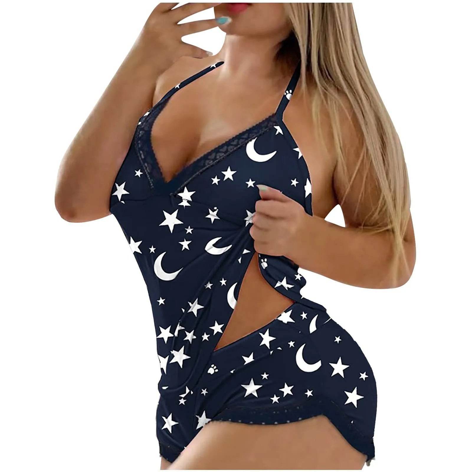 The images showcase the nightgown's stunning design, featuring a playful moon and star pattern that adds a whimsical touch. The halter neckline and side cutouts enhance its allure, making it both sexy and sophisticated.