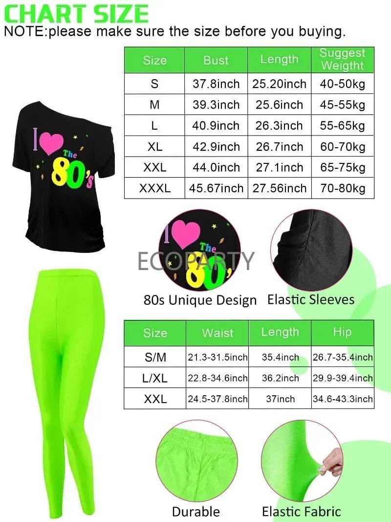 Each set features a colorful ensemble that captures the essence of 80s fashion. From neon leggings and tutus to bold graphic tees, these accessories are all about making a statement. Choose from a variety of colors like Black, Green, and Rose Red, and find your perfect fit with sizes ranging from S to 3XL.