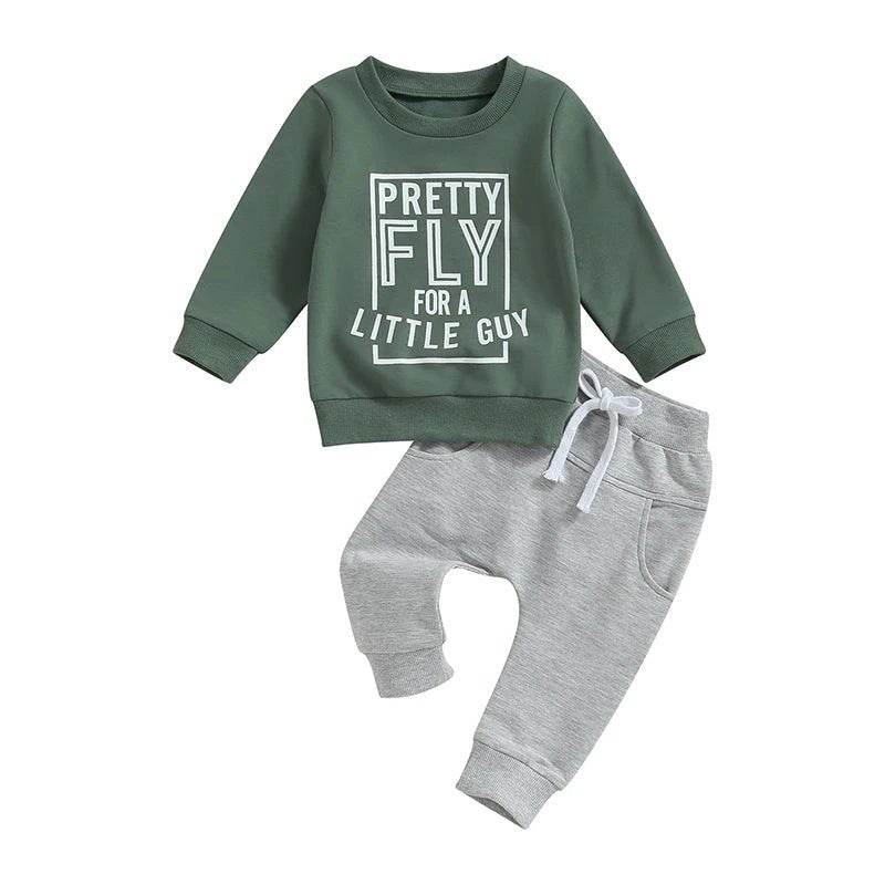 Each set includes a cozy top and matching bottoms, crafted from soft, breathable materials that are gentle on your baby's skin. The playful design features a bold "Pretty Fly for a Little Guy" print, making it a fun and fashionable choice for your little one. Available in colors like white, blue, black, and dark green, there's a perfect match for every personality.