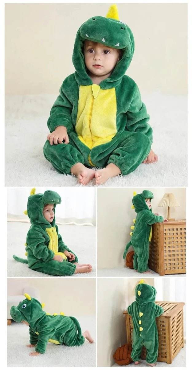The images showcase the costume's vibrant green color with adorable yellow spikes, capturing the essence of a playful dinosaur. The hood features a cute dinosaur face, adding to the charm and appeal of this outfit. Perfect for photos and creating lasting memories!