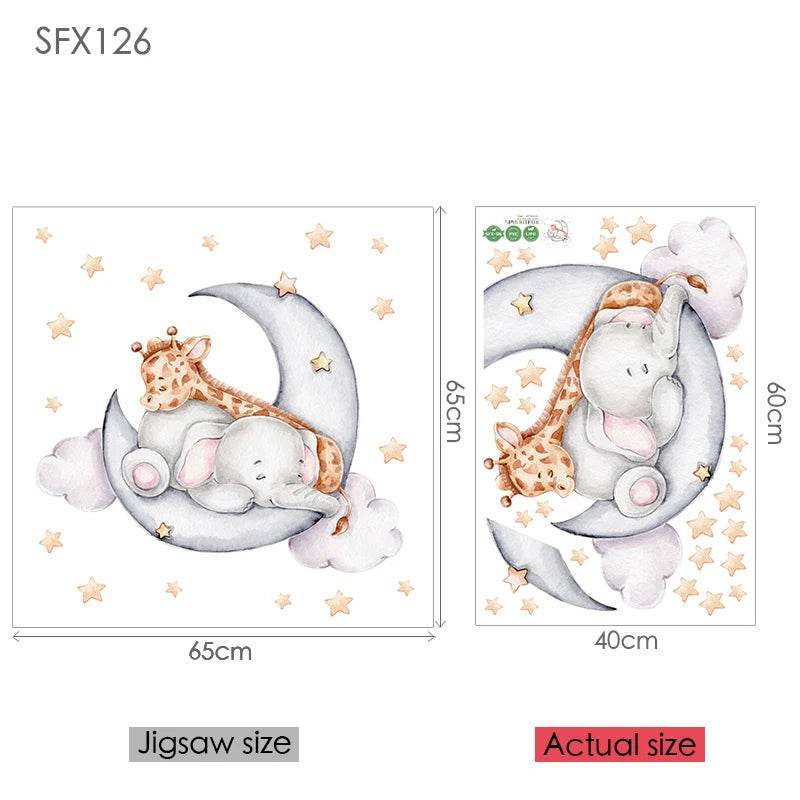 In the images, you'll see how these stickers transform a simple wall into a magical scene. The elephant and giraffe appear to be resting on a crescent moon, surrounded by stars, creating a dreamy atmosphere that encourages creativity and wonder.