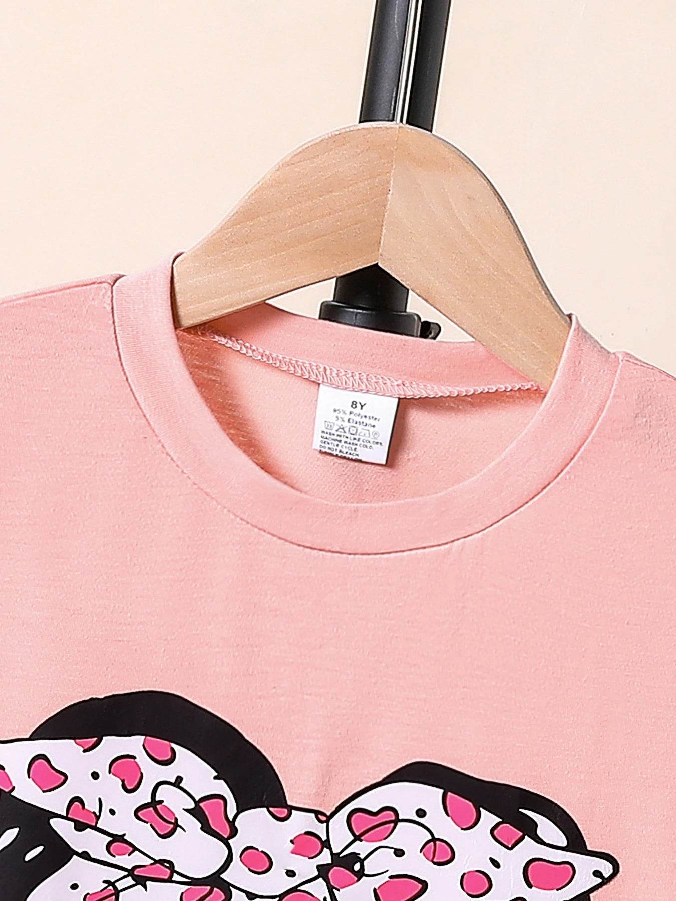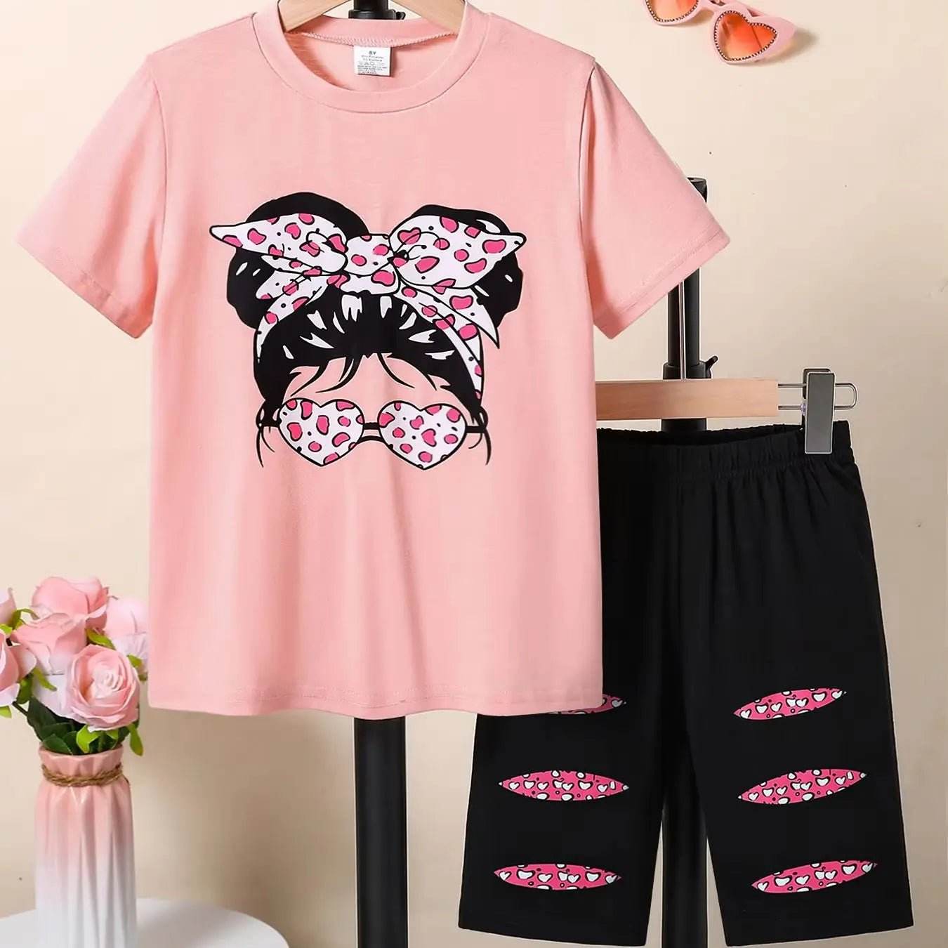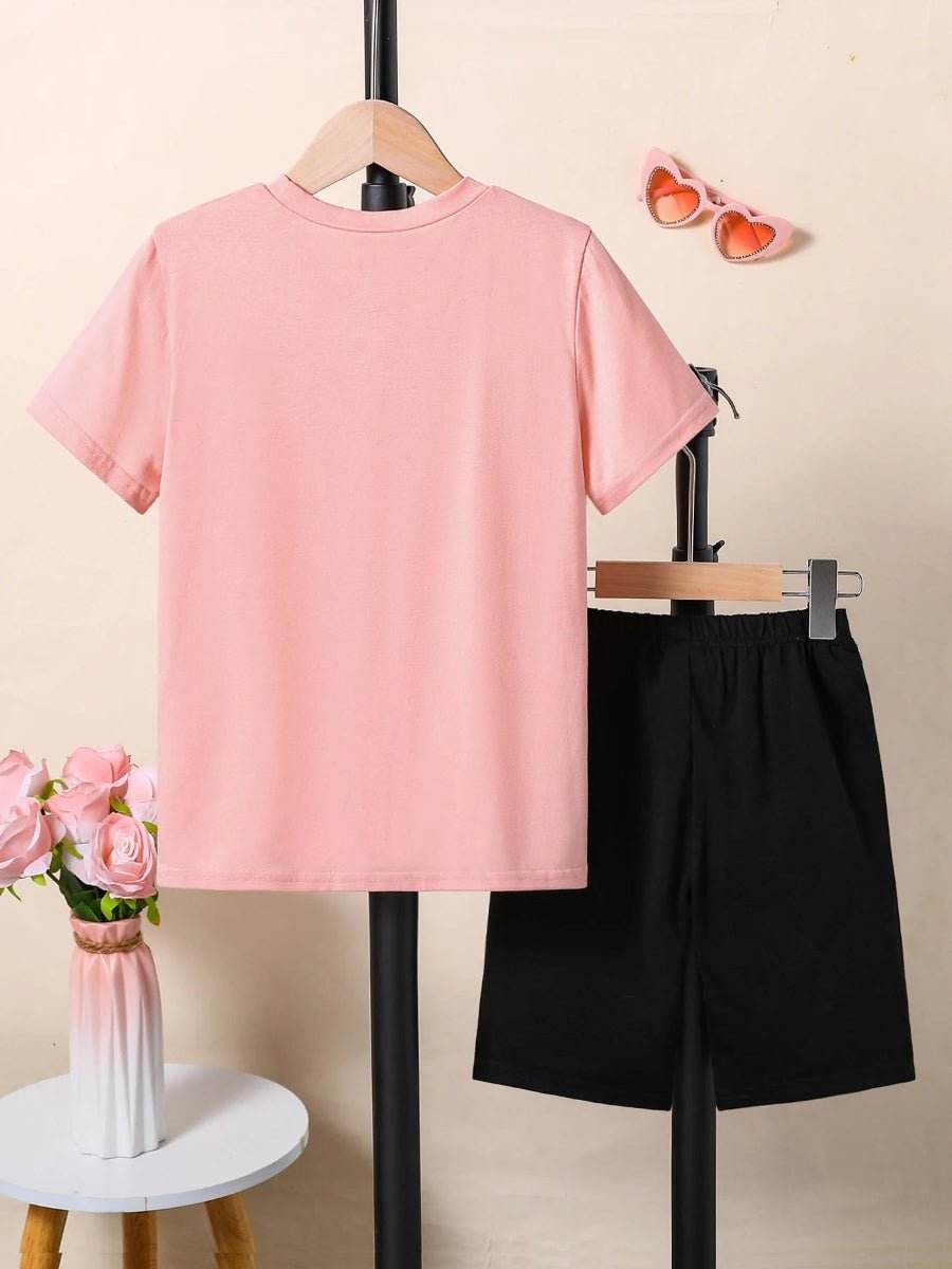 The outfit features a charming pink t-shirt adorned with a graphic design, paired with black shorts that have matching pink accents. This playful combination is perfect for expressing your child's unique style. The set is available in various sizes, catering to kids aged 8 to 12 years, ensuring a perfect fit for your growing child.