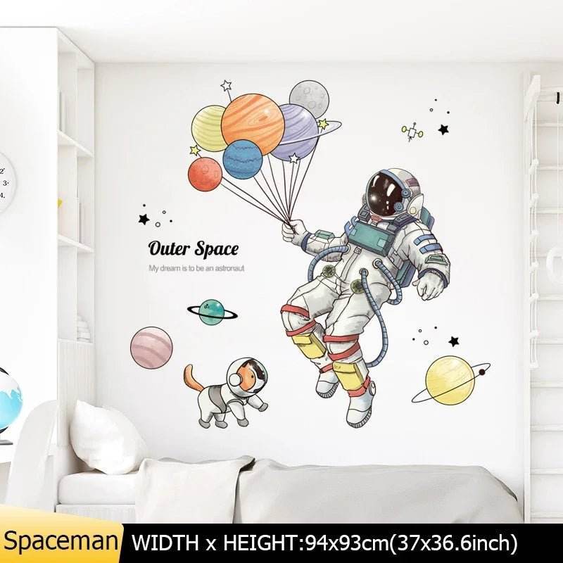 The images showcase a vibrant scene of astronauts floating among planets and stars, capturing the essence of space exploration. One sticker even features an astronaut playing a guitar, adding a whimsical touch to the decor. These stickers are not just decorations; they're a gateway to adventure and learning.