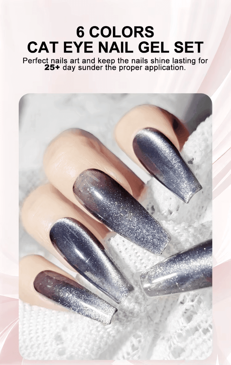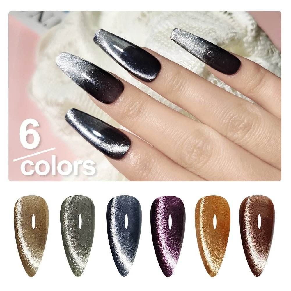 The images showcase the polish's stunning color range, from shimmering silvers to deep purples, each shade offering a unique magnetic effect. The polish glides on smoothly, creating a flawless finish that catches the light beautifully.