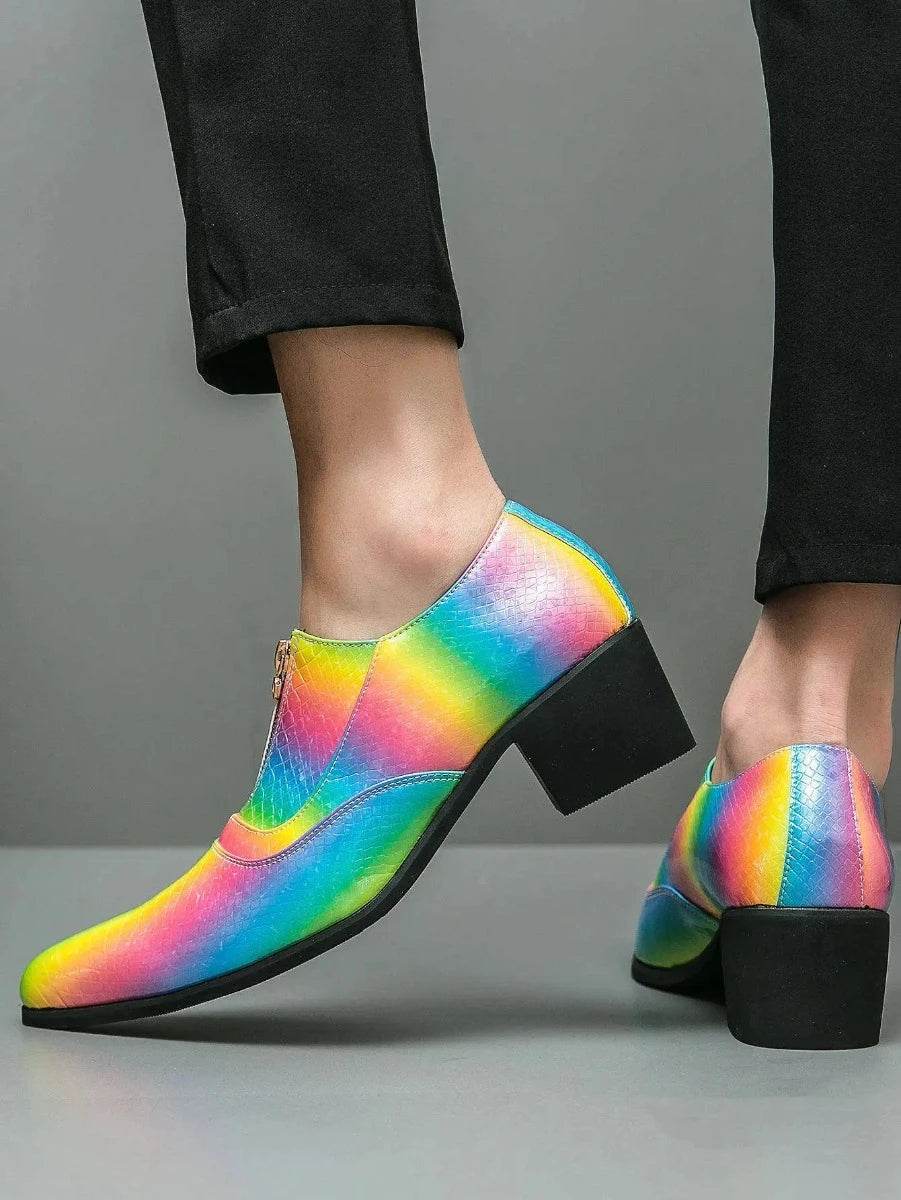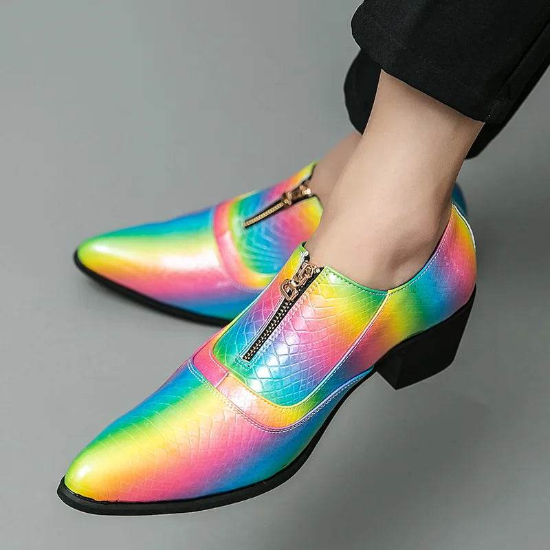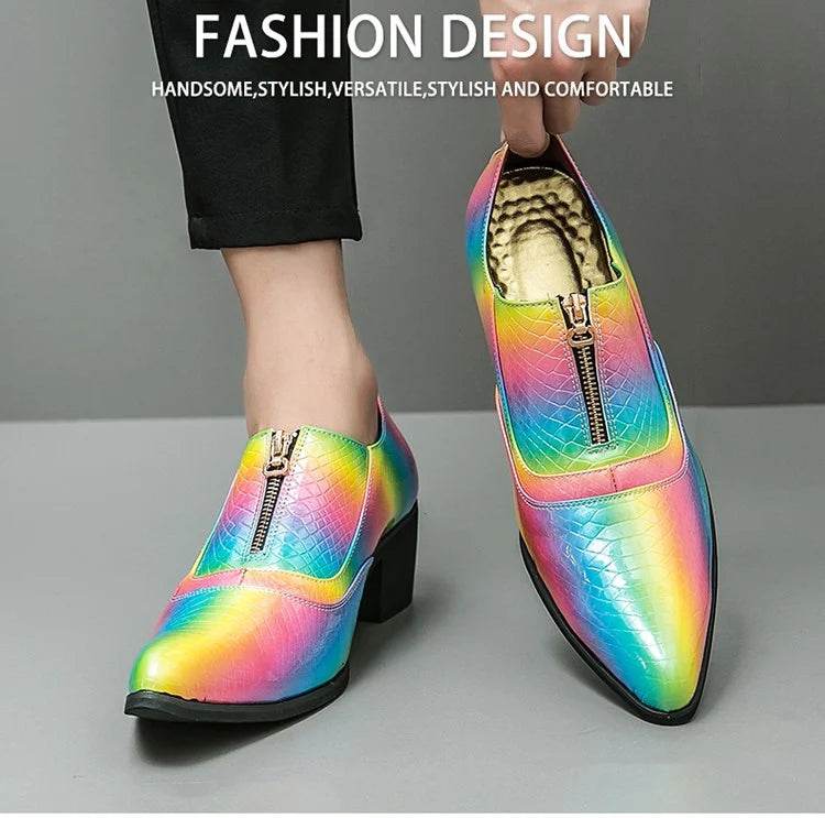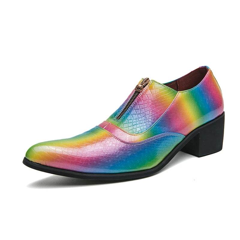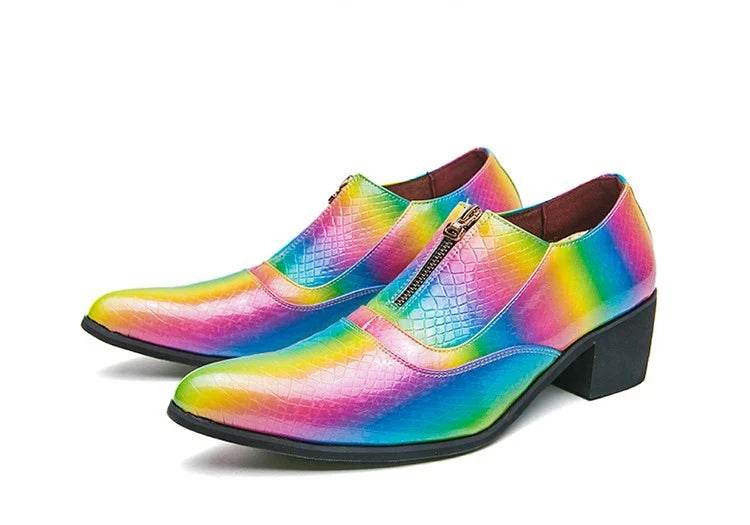 Elevate your style with our Men Crocodile Leather Rainbow Loafers by Oein. These designer formal shoes are crafted from luxurious crocodile skin, featuring a vibrant rainbow pattern that ensures you make a statement at any event. Perfect for weddings, parties, or any special occasion where you want to shine.