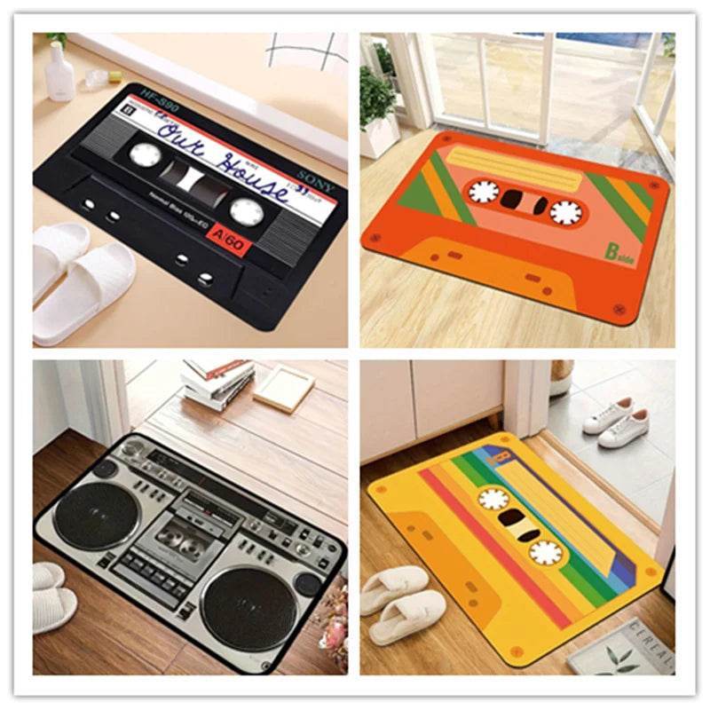 Featuring a classic boombox and tape design, this doormat is a vibrant tribute to the 90s. The images show a variety of colorful designs, including iconic cassette tapes and a boombox, each bringing a splash of color and fun to your doorstep. Available in multiple colors and a convenient size of 40x60cm, it fits perfectly in any home setting.